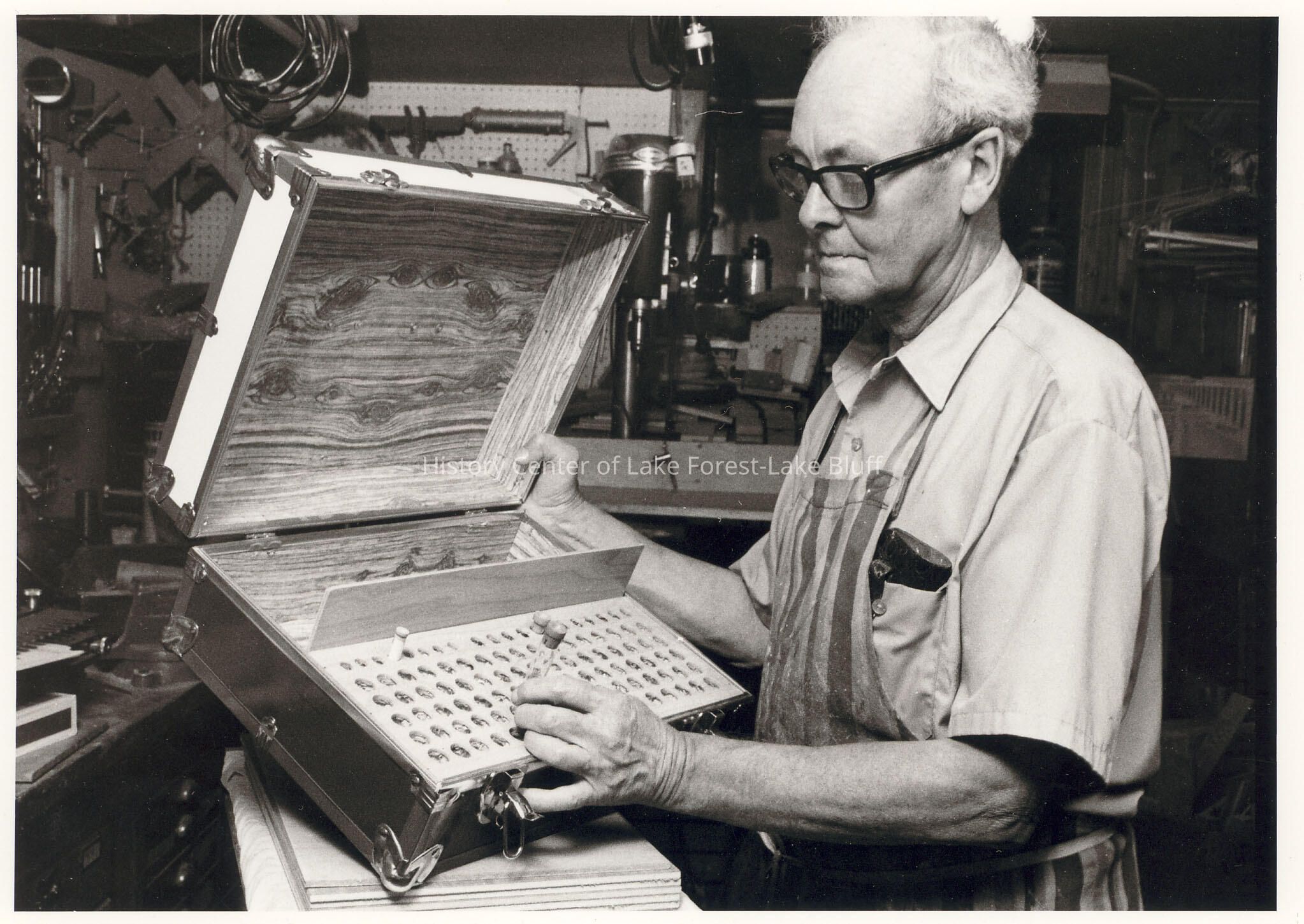 Women's Auxiliary: Older man in workshop holding what looks like suitcase to transport blood samples.