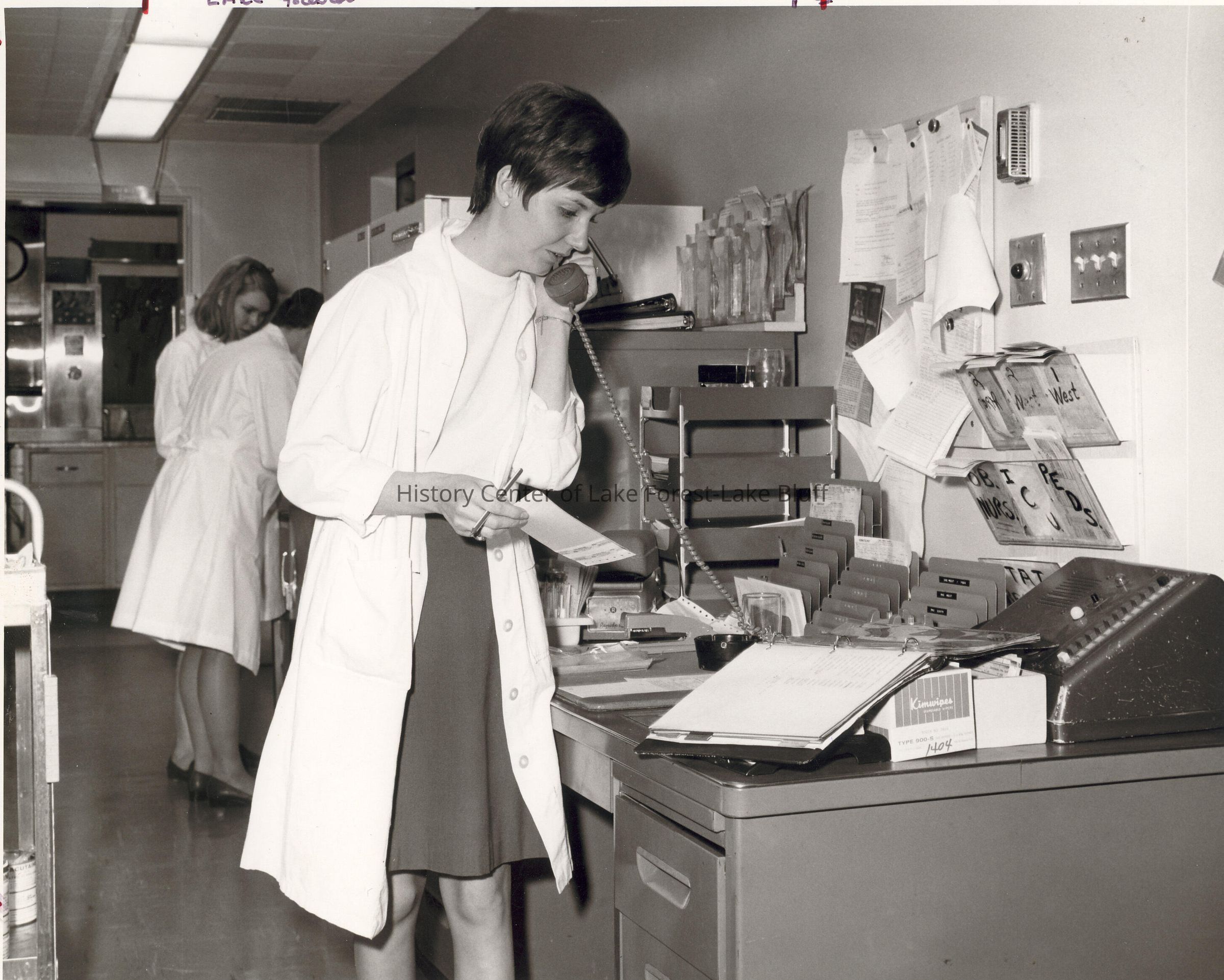 Female in lab setting answering the phone.