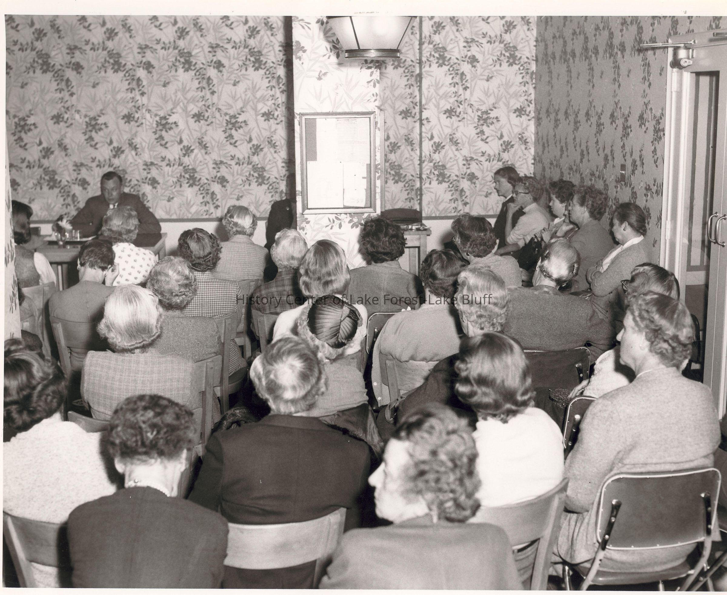Women's Auxiliary. Women in a conference room facing a man at a table.