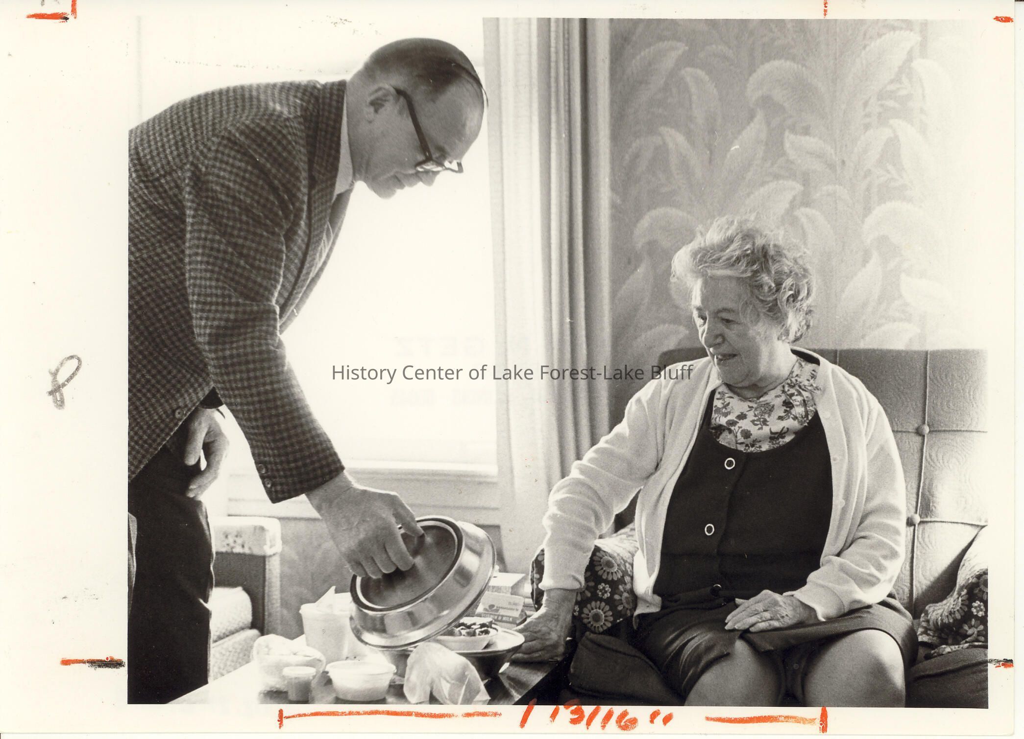 Volunteers: Man in suit presumably serving hospital meal to female sitting on a sofa.