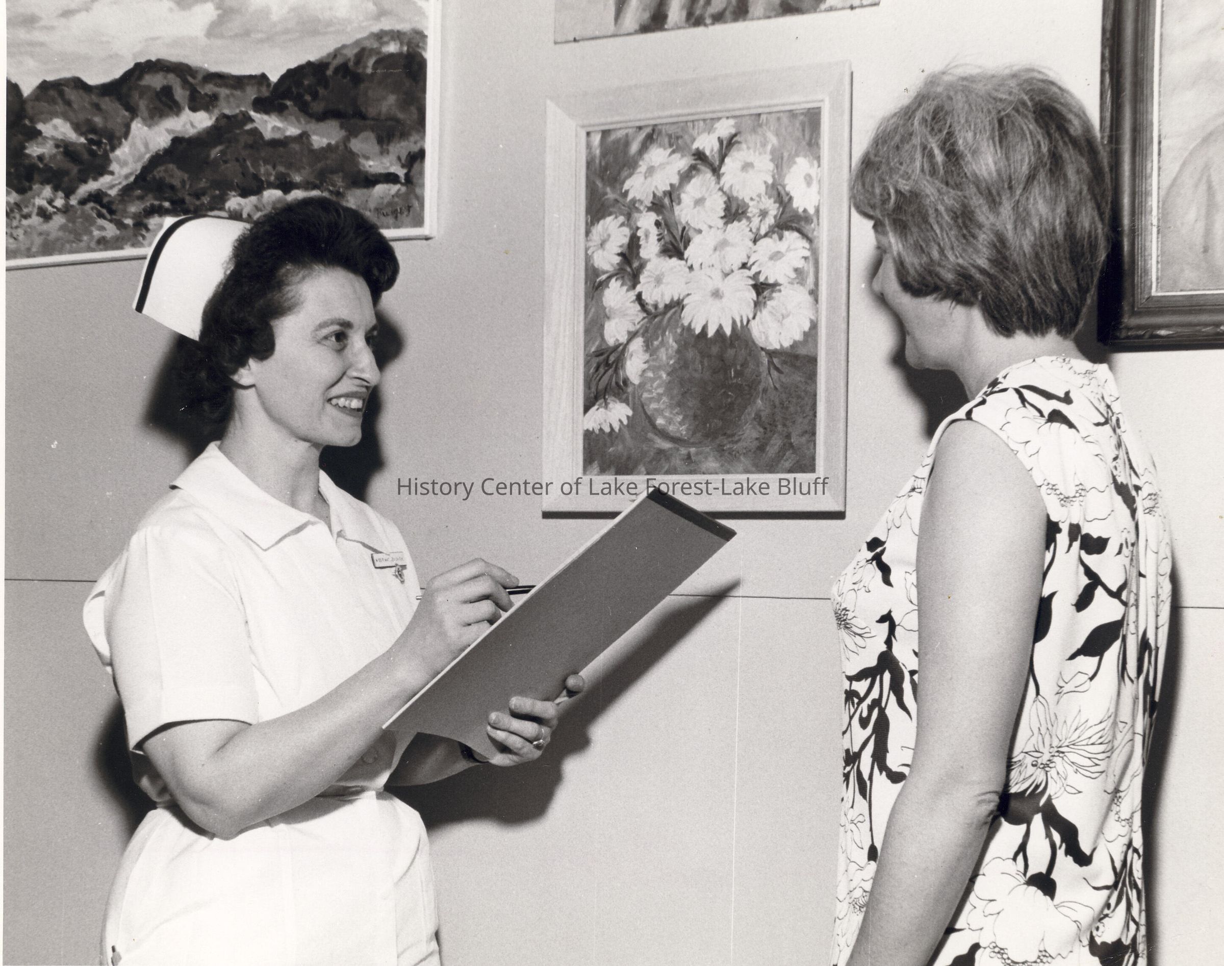 Nurse with note pad presumably asking questions of a woman.
