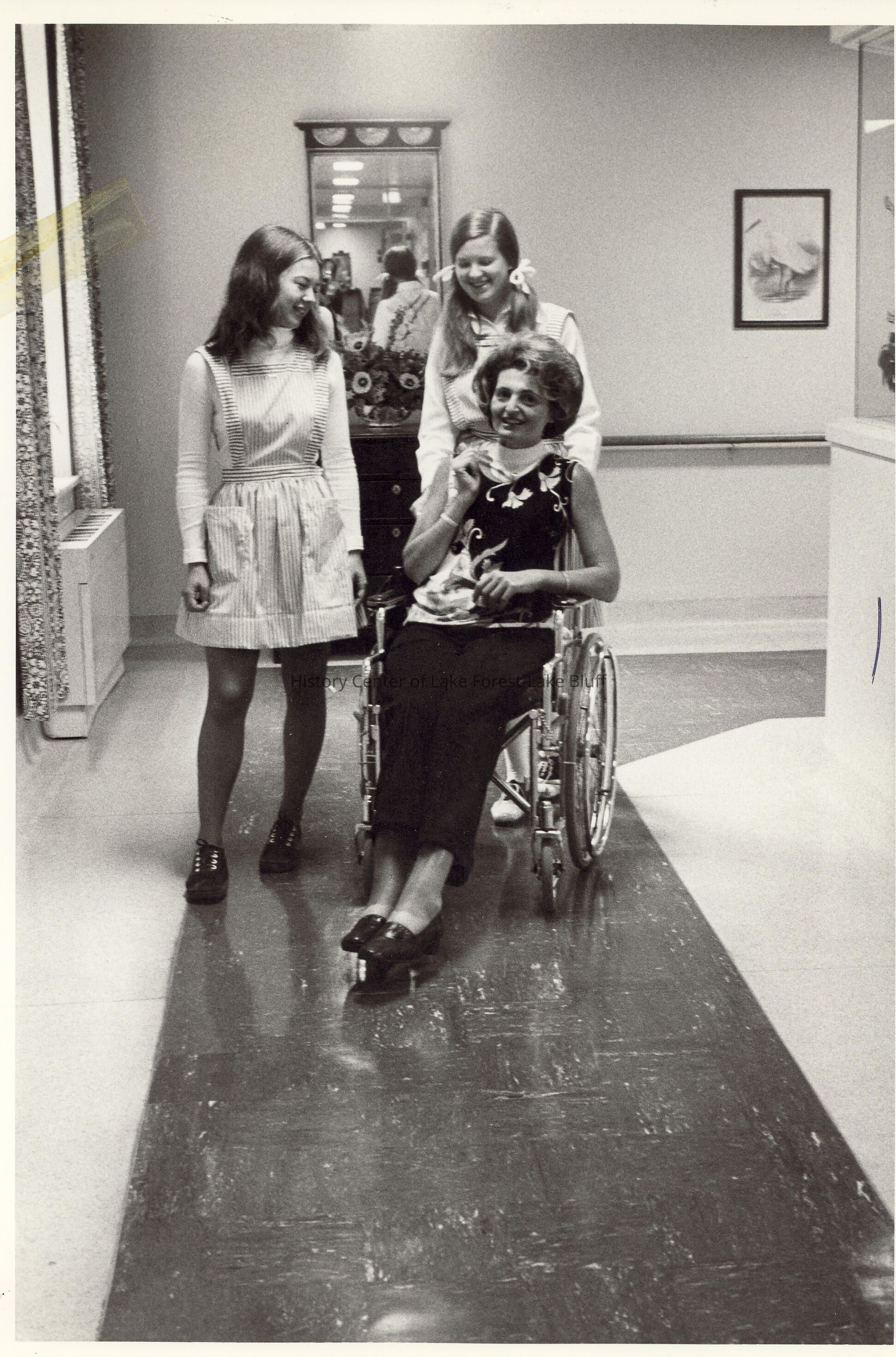 Two Candy Stripers pushing patient in wheelchair.