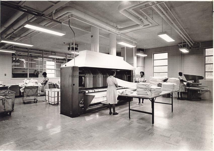 Four female employees working in laundry room.