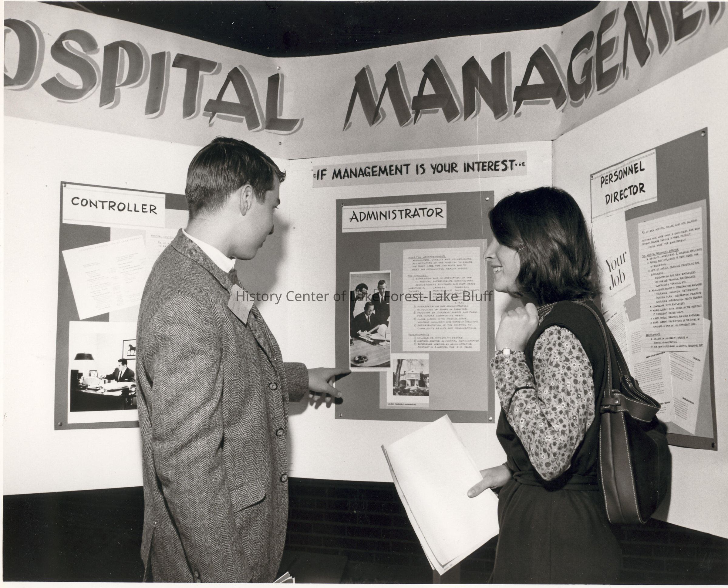 Job Fair: Young man and young lady in front of Hospital Management display.