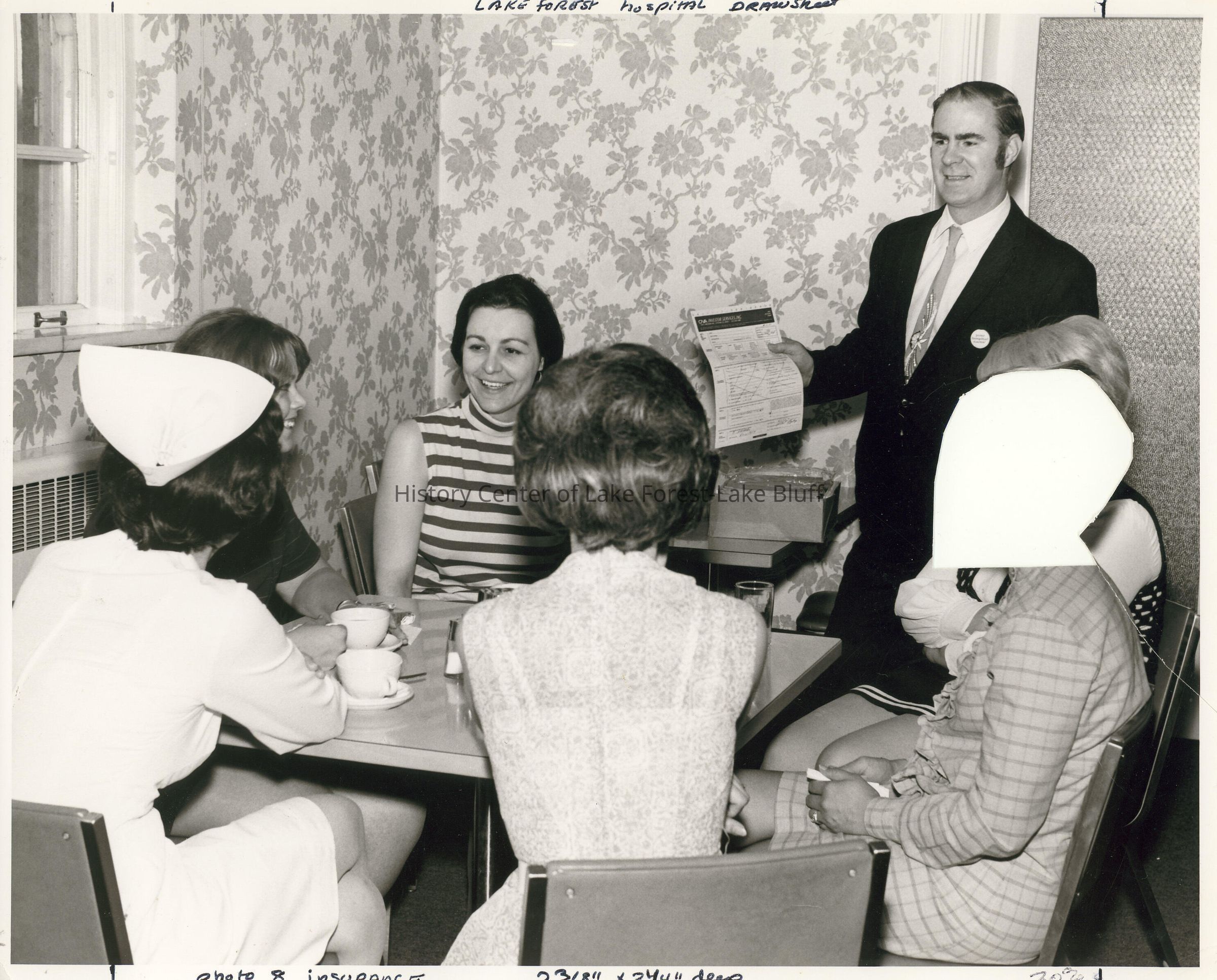 Man in suit holding a document and speaking to 6 women, one in a nurses uniform and at least one whose head was cut out of picture.