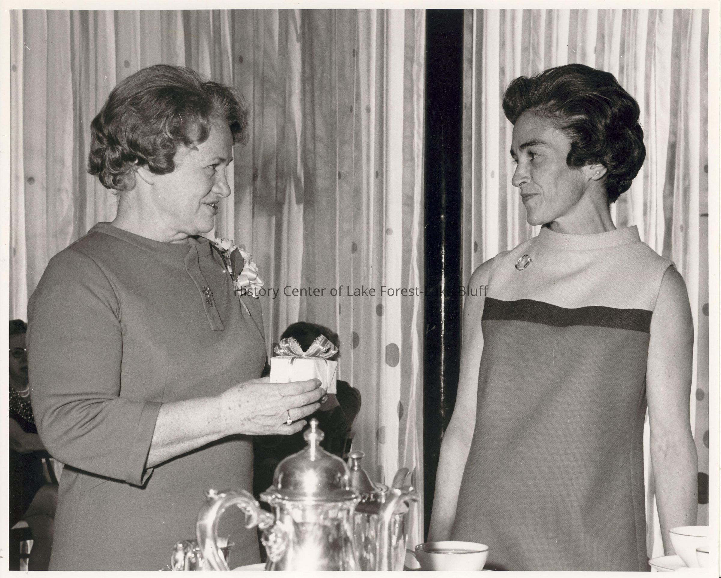 Women's Auxilliary: Two women standing near coffee set. One is holding small gift.