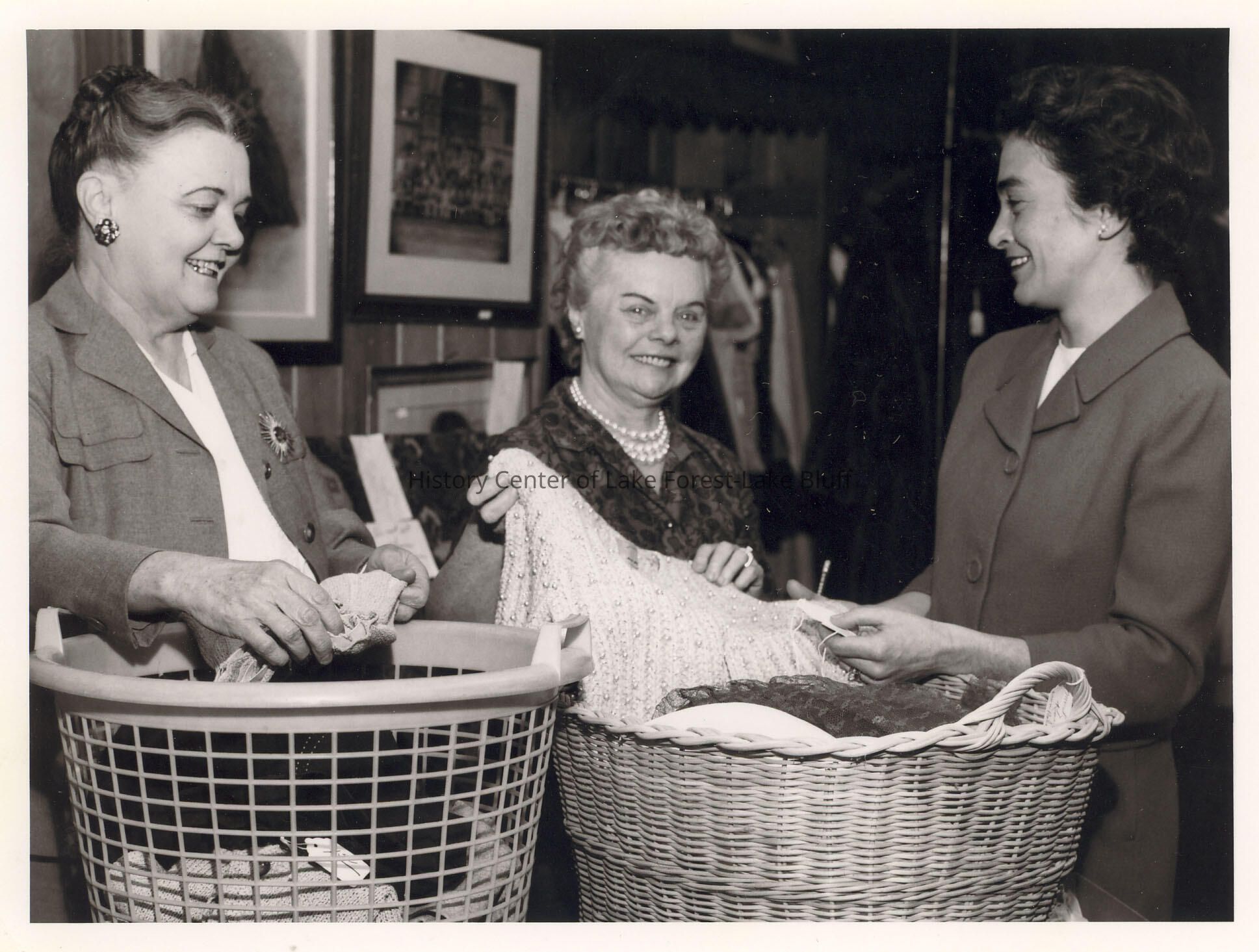 Women's Auxiliary: Three women reviewing contributions for upcoming rummage sale.