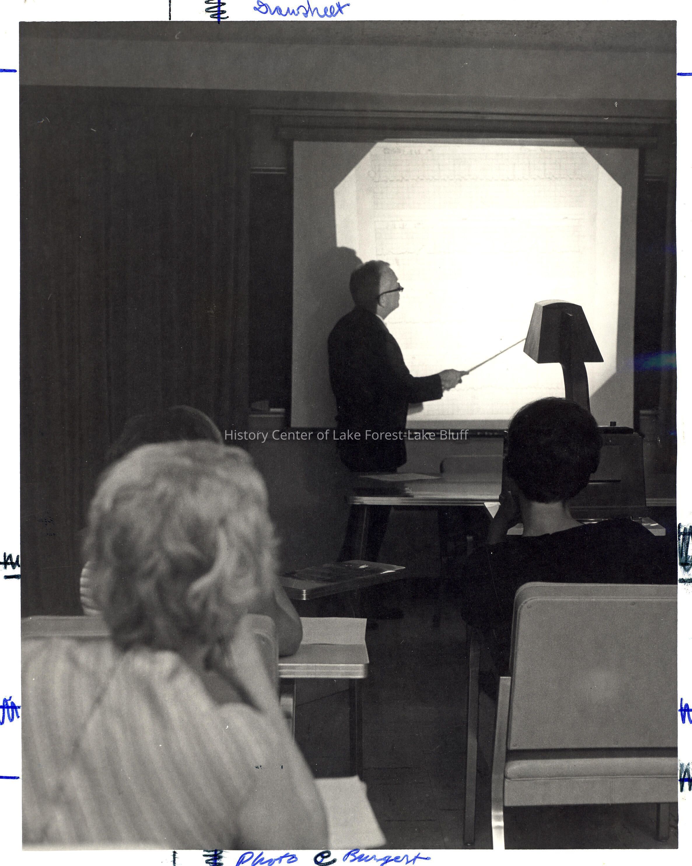 Man in suit pointing to overhead projector projection with at least two women in audience observing.