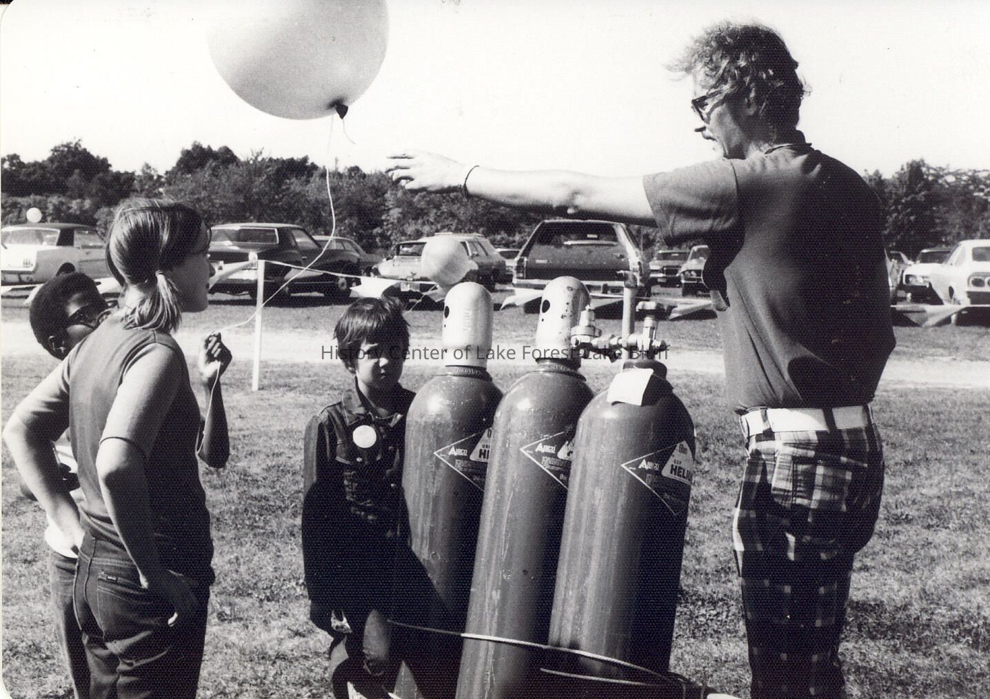 Man with 3 helium tanks inflating balloons.