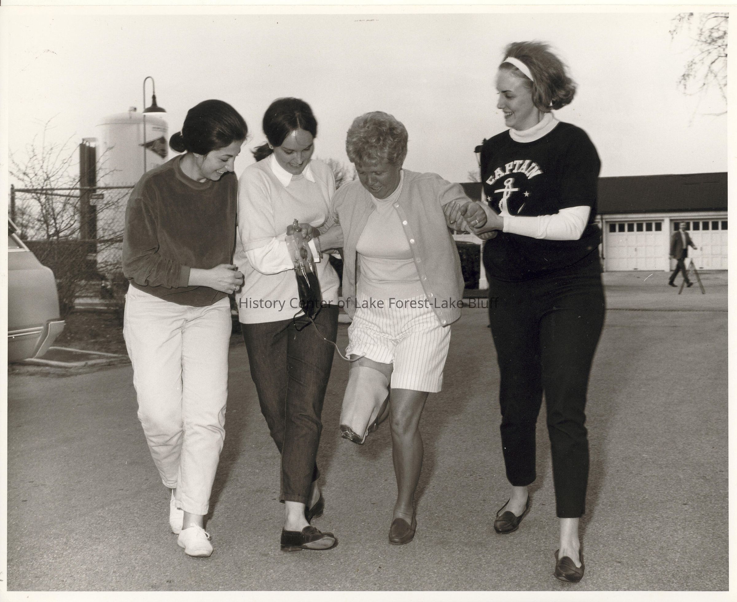 Photo taken outdoors showing three women helping a woman walk who apparently is attached to a bag of blood. Folder is labeled Disaster Drill. Barb Porter LPN and Pat Riley GPN.