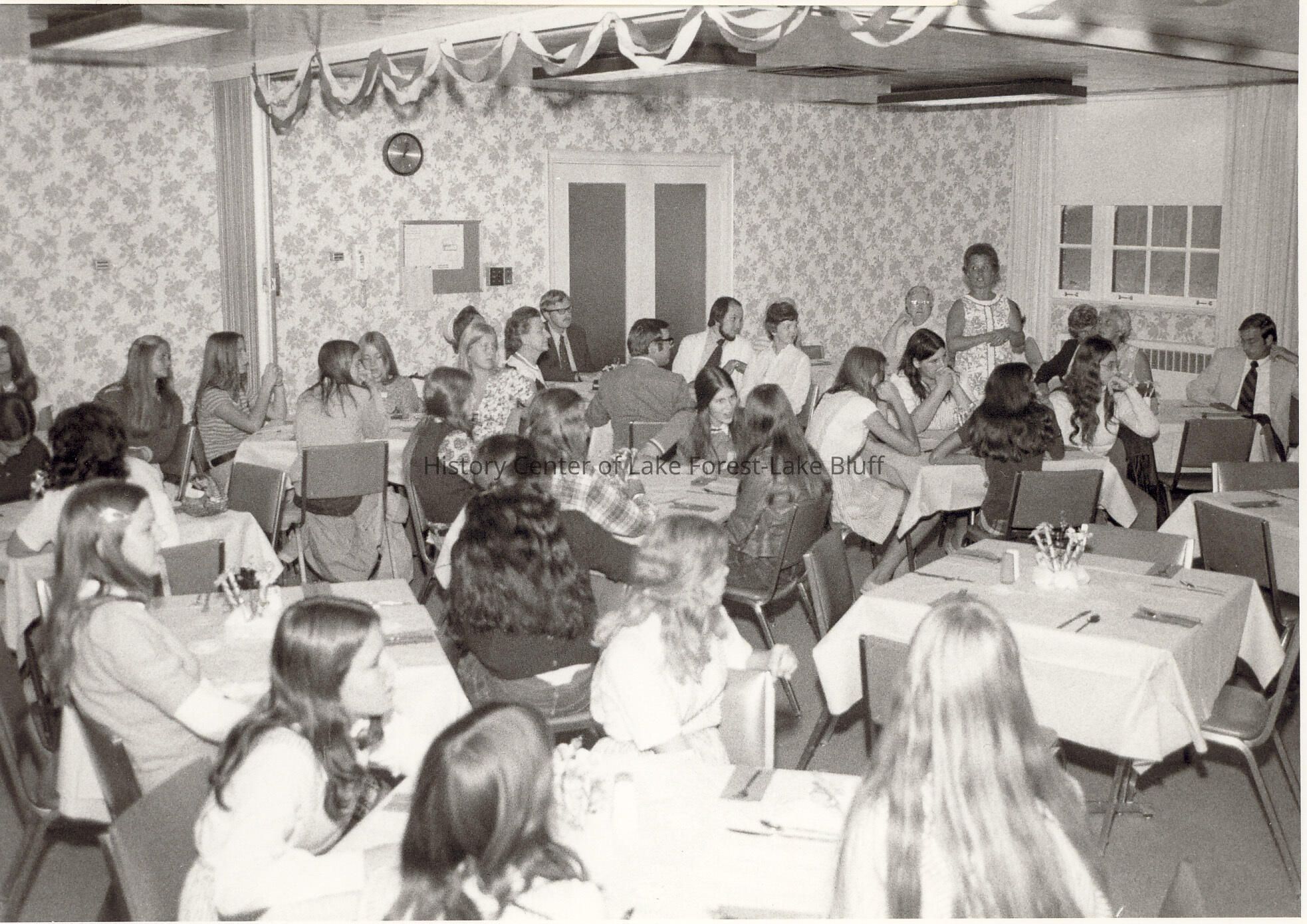 Candy Stripers and adults, listening to a speaker, in what looks like a cafeteria or restaurant setting.