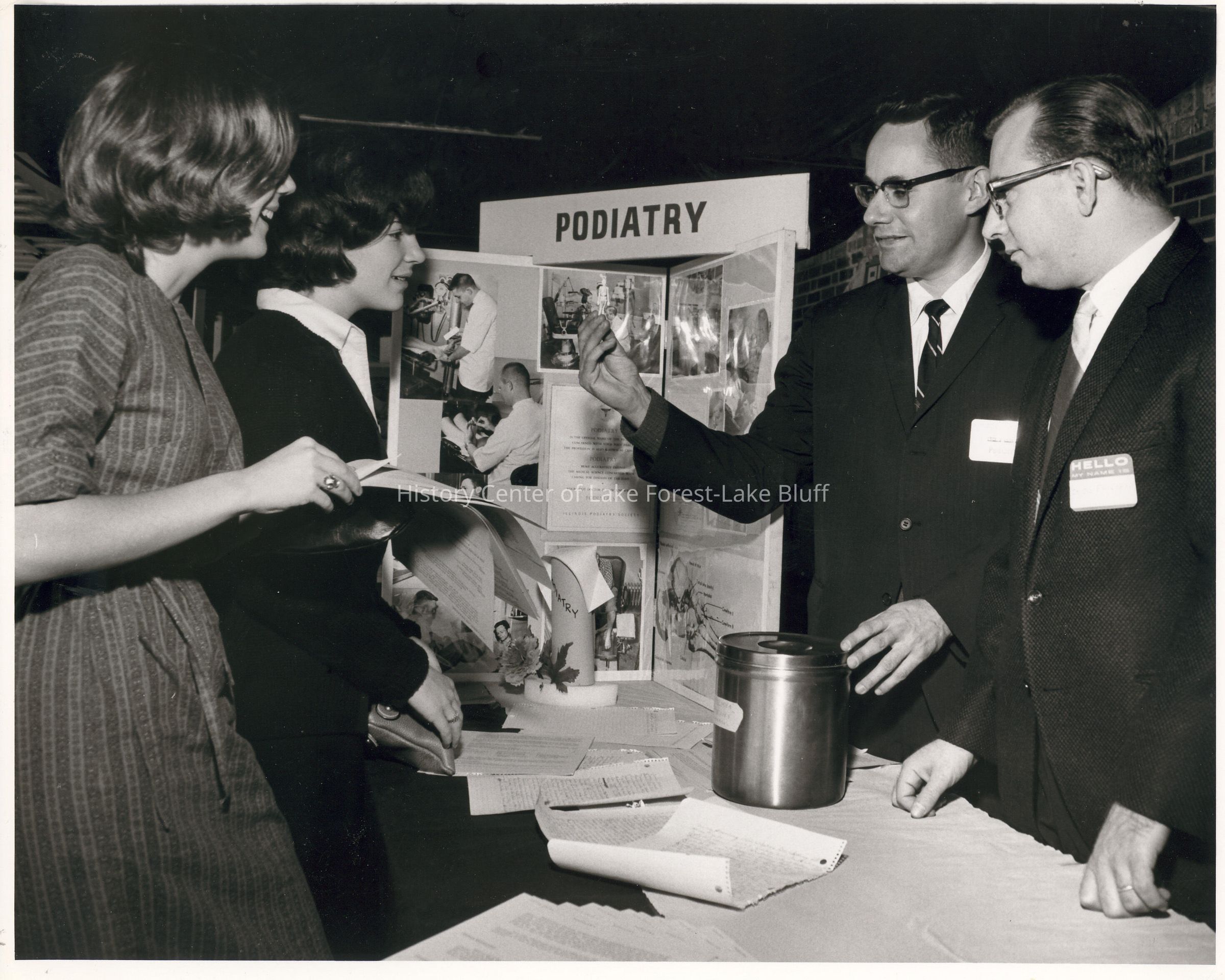 Job Fair: Two men in suites, presumably Podiatrists, speaking to two female students.