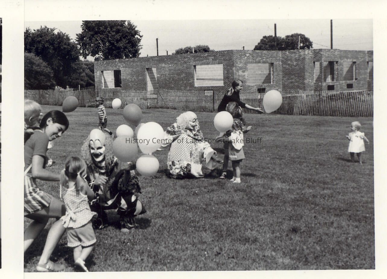 Two clowns and many balloons with small children on lawn. Presumably Baby Alumnae party.