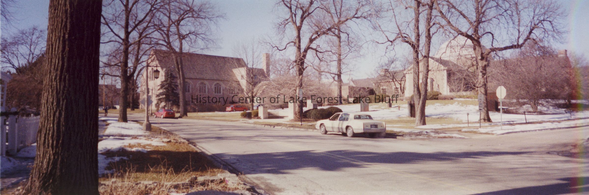 Panoramic photo of Lake Forest Library and Church of The Covenants from Deerpath. March 2000