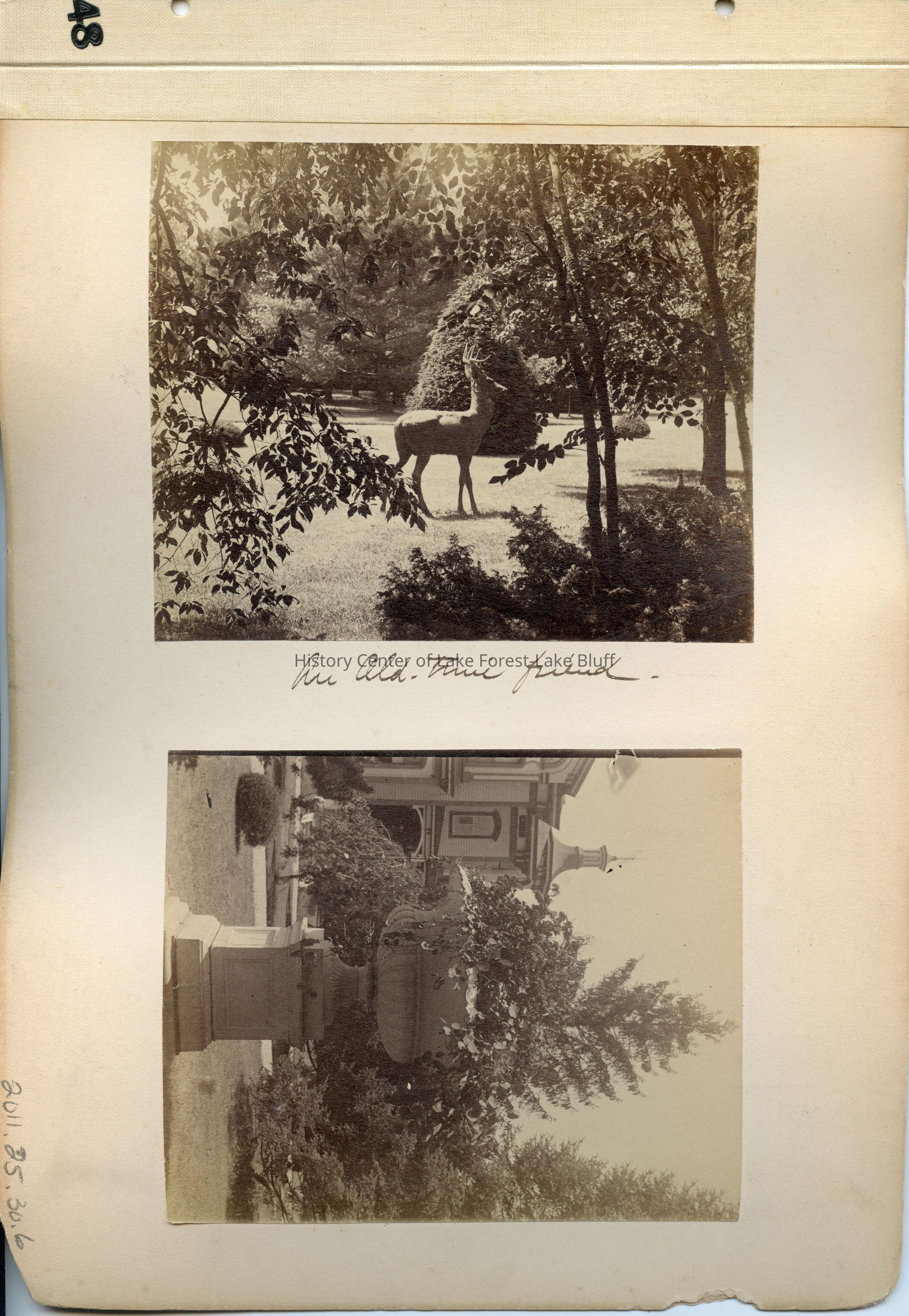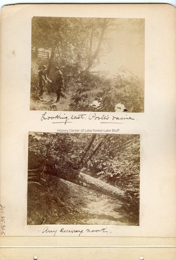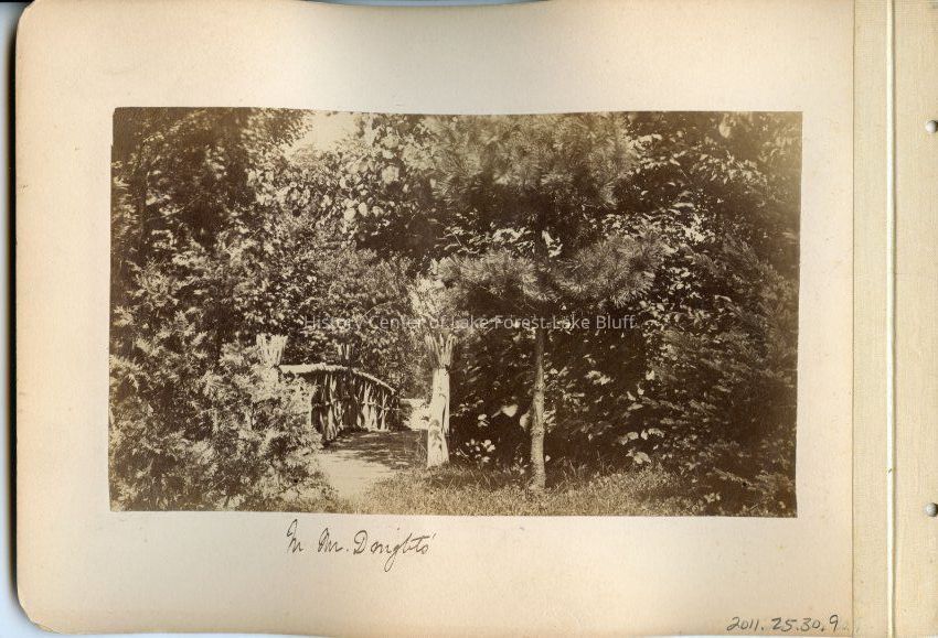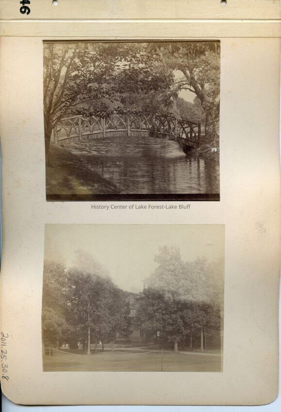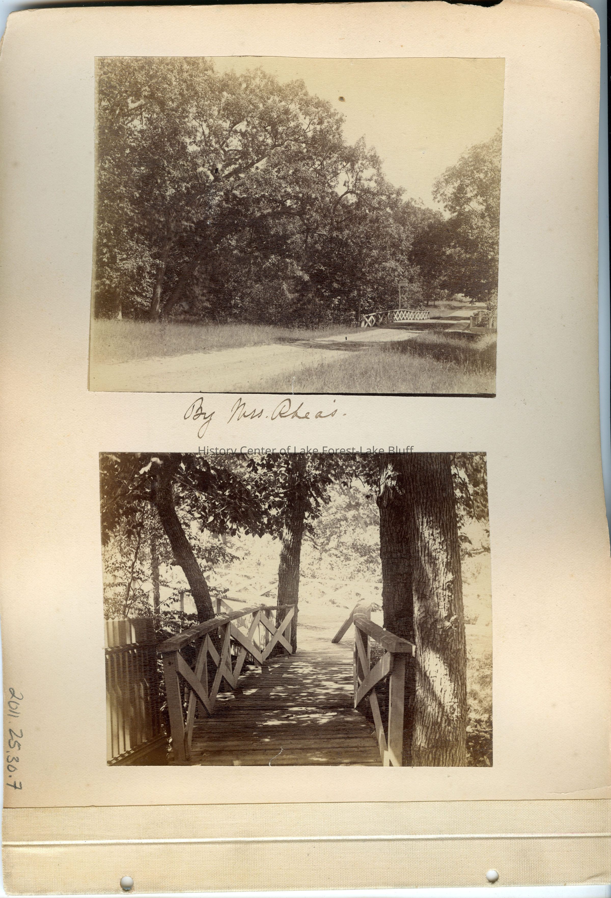 Six double-sided pages from a photograph album. 1.) The Church bridge, Sheridan Road facing north. Possibly First Presbyterian Church turret visible in rear. 2.) Dining room of unidentified house. 3.) Looking east ??? ravine. Same as 2011.25.28. 4.) John V. Farwell House, 888 East Deerpath. 5.) Two men, Looking east, Poole's Ravine. 6.) Any sunny? nook. Fallen tree in ravine. Same as 2011.25.11. 7.) An Old Time Friend. Deer statute. Same as 2011.25.6. 8.) Close-up of large urn in front of Farwell House. 9.) By Mrs. Rhea's. Road and bridge. 10.) Walking bridge. Same as 2011.25.5. 10.) Likely bridge over Farwell Pond, Fairlawn. Similar to 2011.25.4. 11.) Rear of house. Tennis court. 12.) Mr. Dwight's. Walking bridge. May be John H. Dwight on Lake Avenue. 13.) Looking east, Poole's Road. Same as 2011.25.26.Lexicon