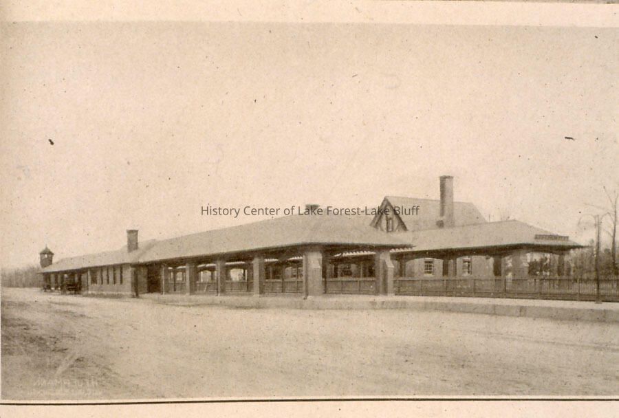 Scenes of Lake Forest C &NW Railroad station Platform sign may be reversed. Single elevated crossing tower would be at Deerpath.