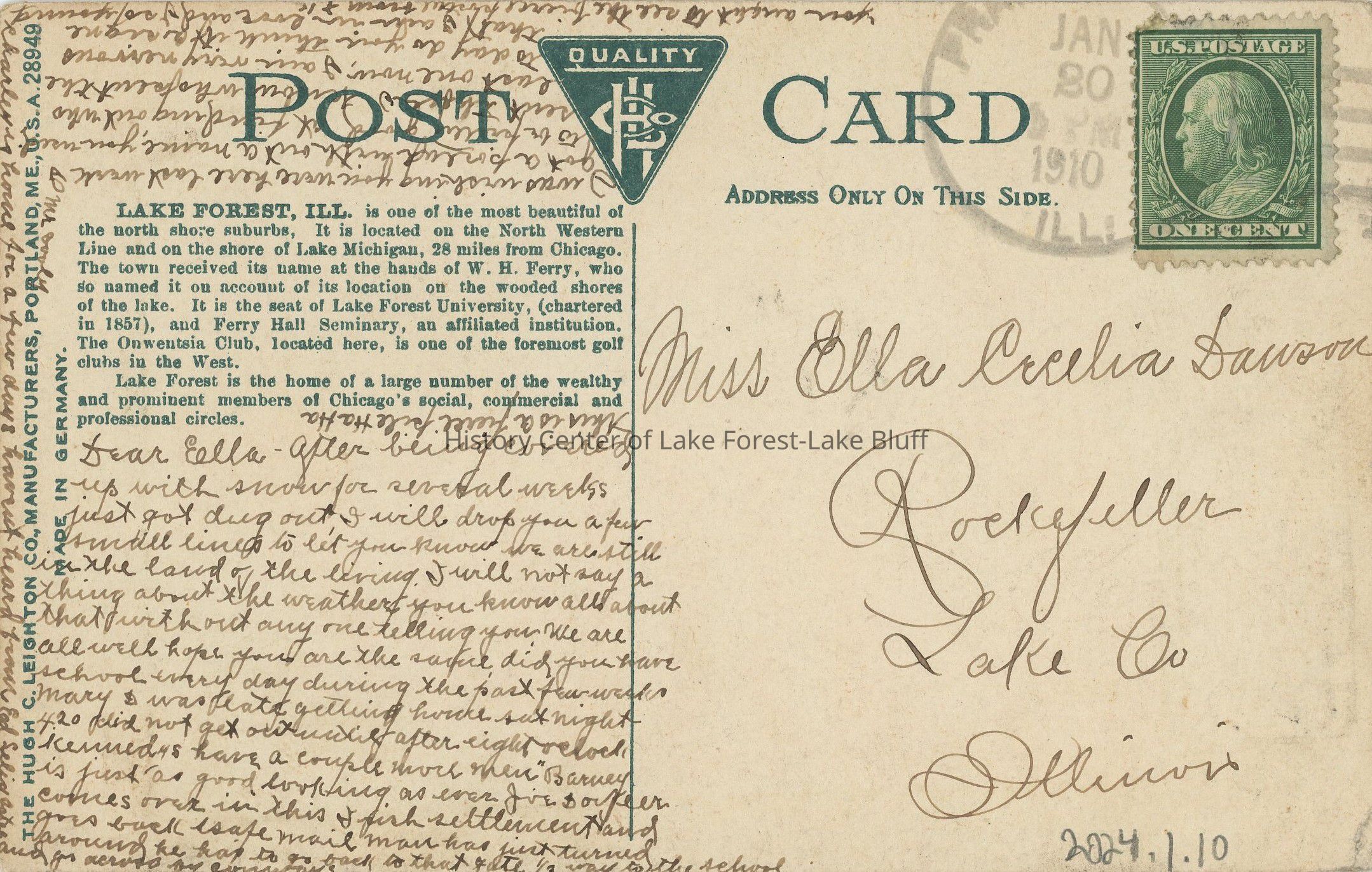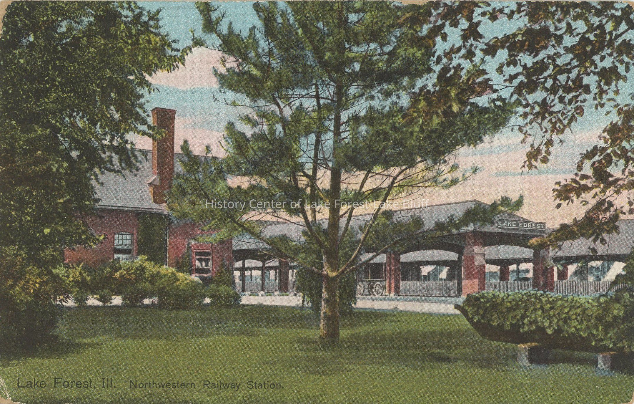 The image shows the Lake Forest, Illinois Northwestern Railway Station surrounded by lush greenery and trees.