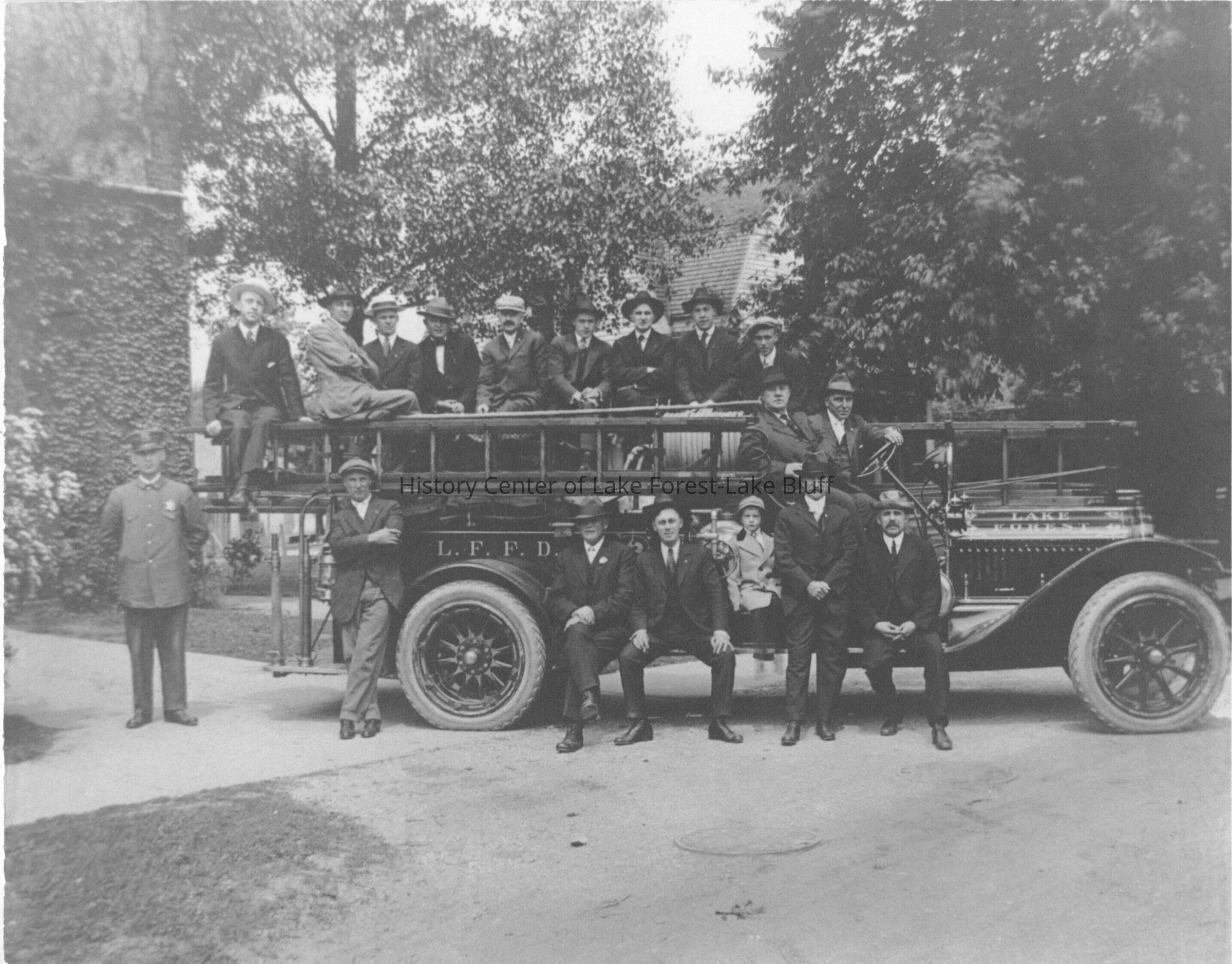 Lake Forest Volunteer Fire Department standing in front of engine. Mounted on cardboard.