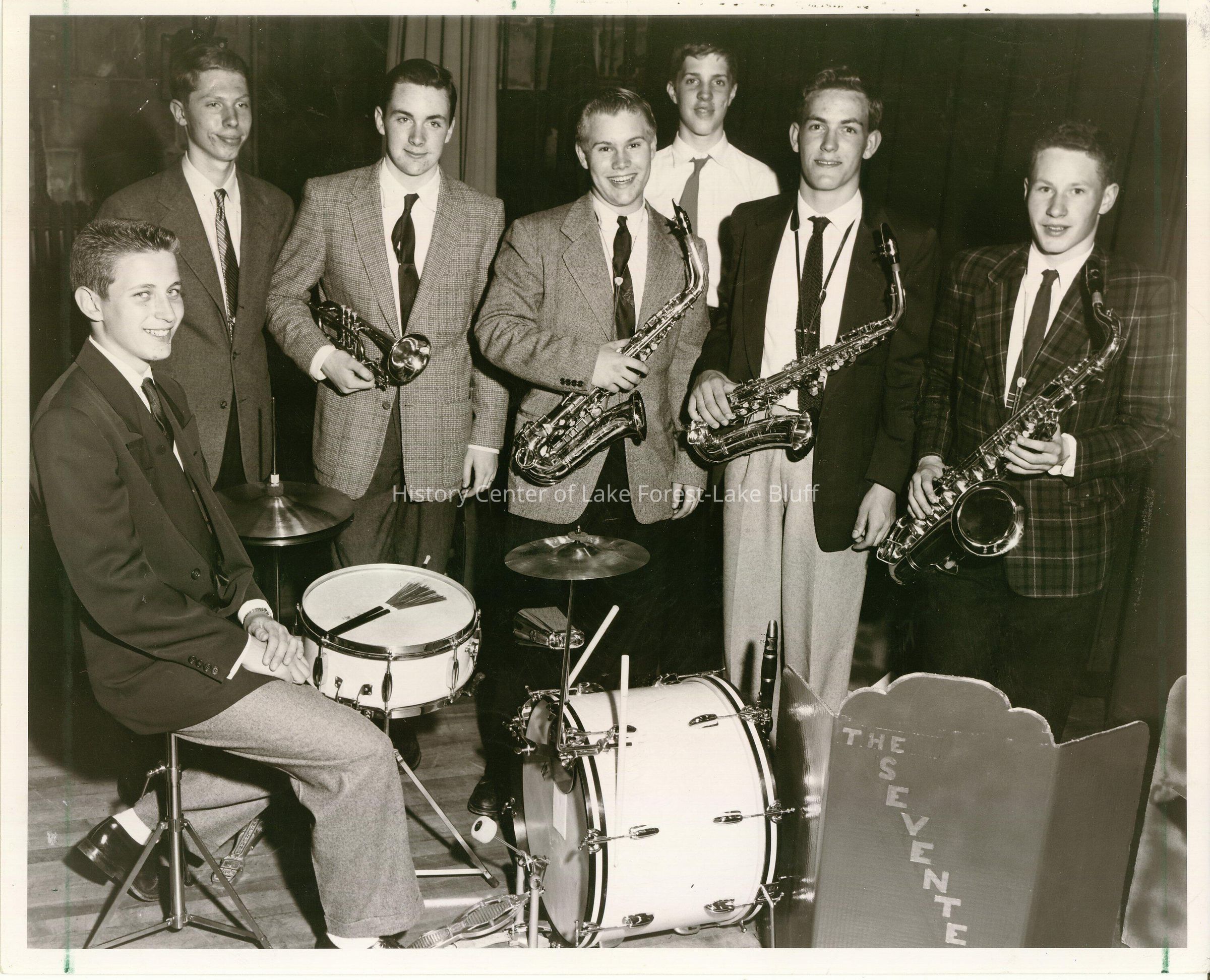 A band called "The Seventeens" poses for a photo. A group of teenage boys in suits with saxophones.