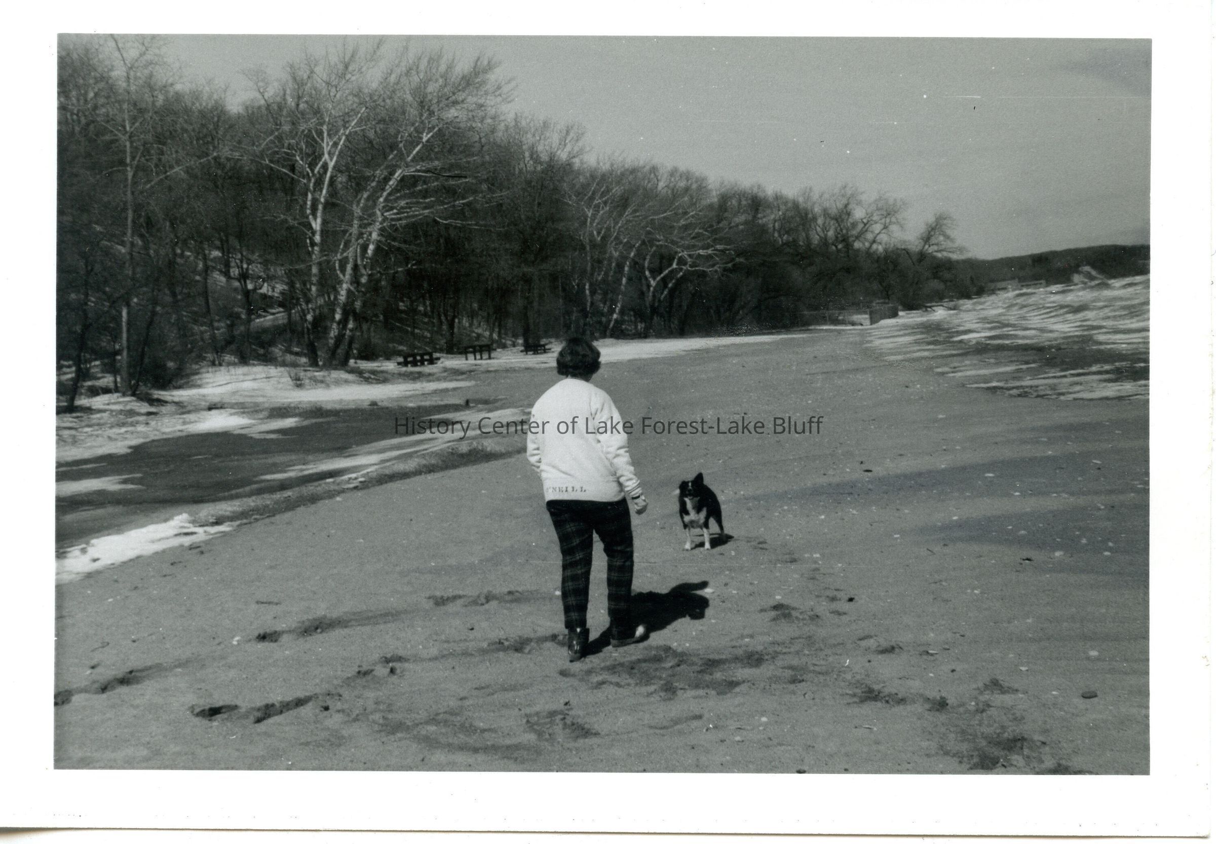Woman and dog on beach of Lake Michigan. Woman is wearing a sweatshirt with the word O'Neill on the back.