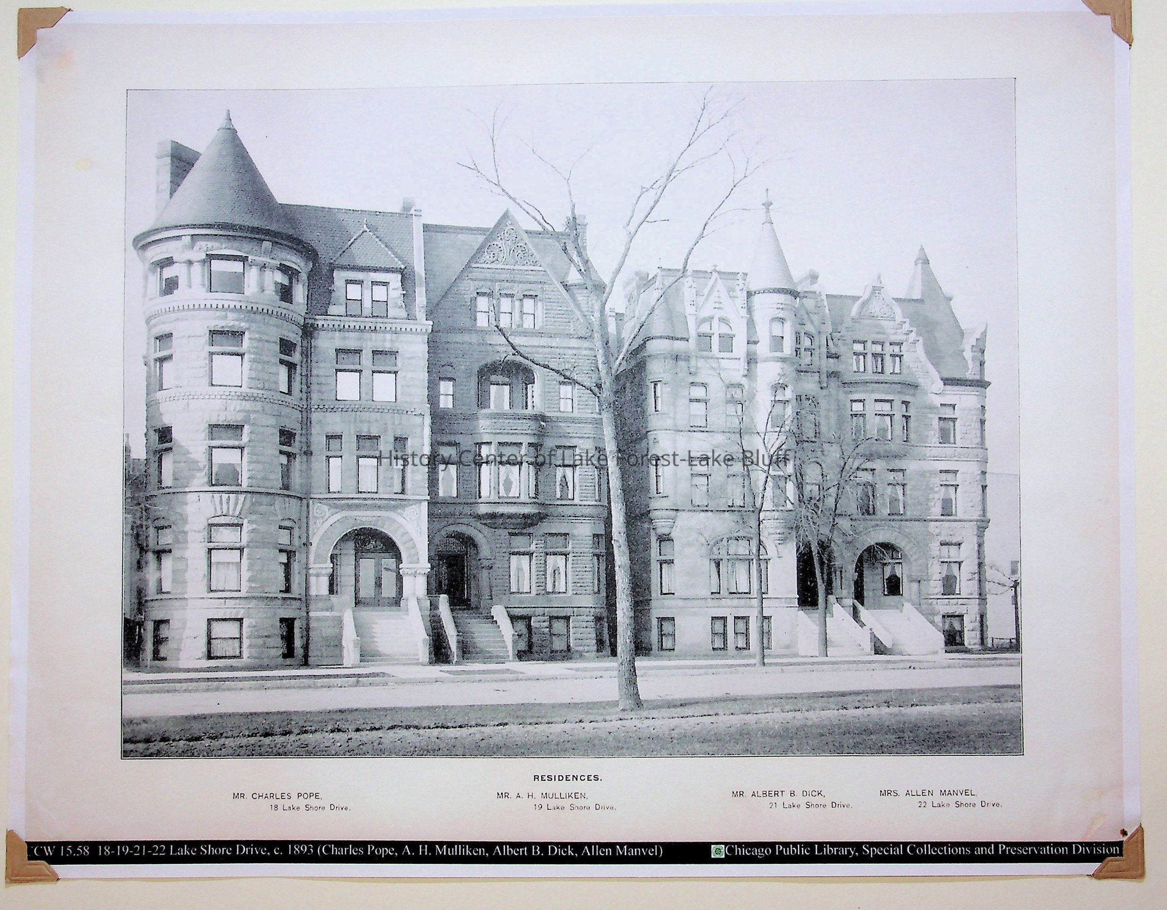Copy of photograph of 21 S. Lake Shore Drive, Chicago home of Albert Blake Dick. Photograph also includes residences of Charles Pope, A. H. Mulliken, and Mrs. Allen Manvel. Original at Chicago Public Library.