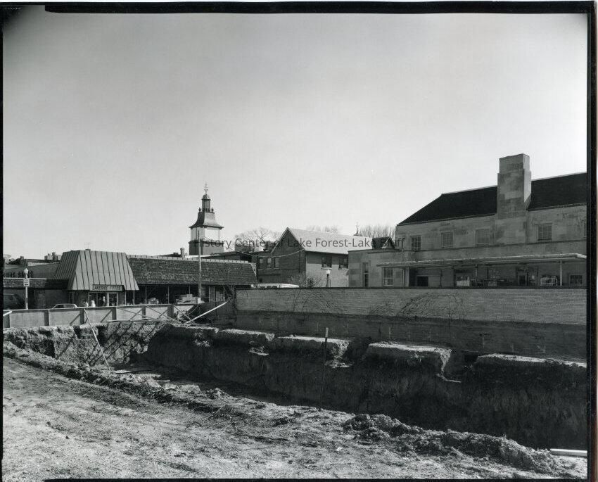 Lakeside Foods grocery store (725 N. Bank Lane) and former city parking lot, under construction, back of post office building is visible
