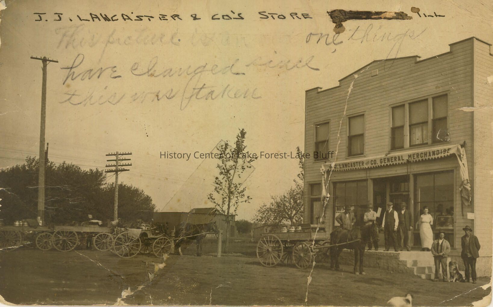 J.J. Lancaster & Co. Store in Everett, IL. Wagons at proper right with electrical polls. Two story business at right with men and women posing on the porch. Addressed to Rainbow Girls, postmark of August 1923 and message written on back of postcard.