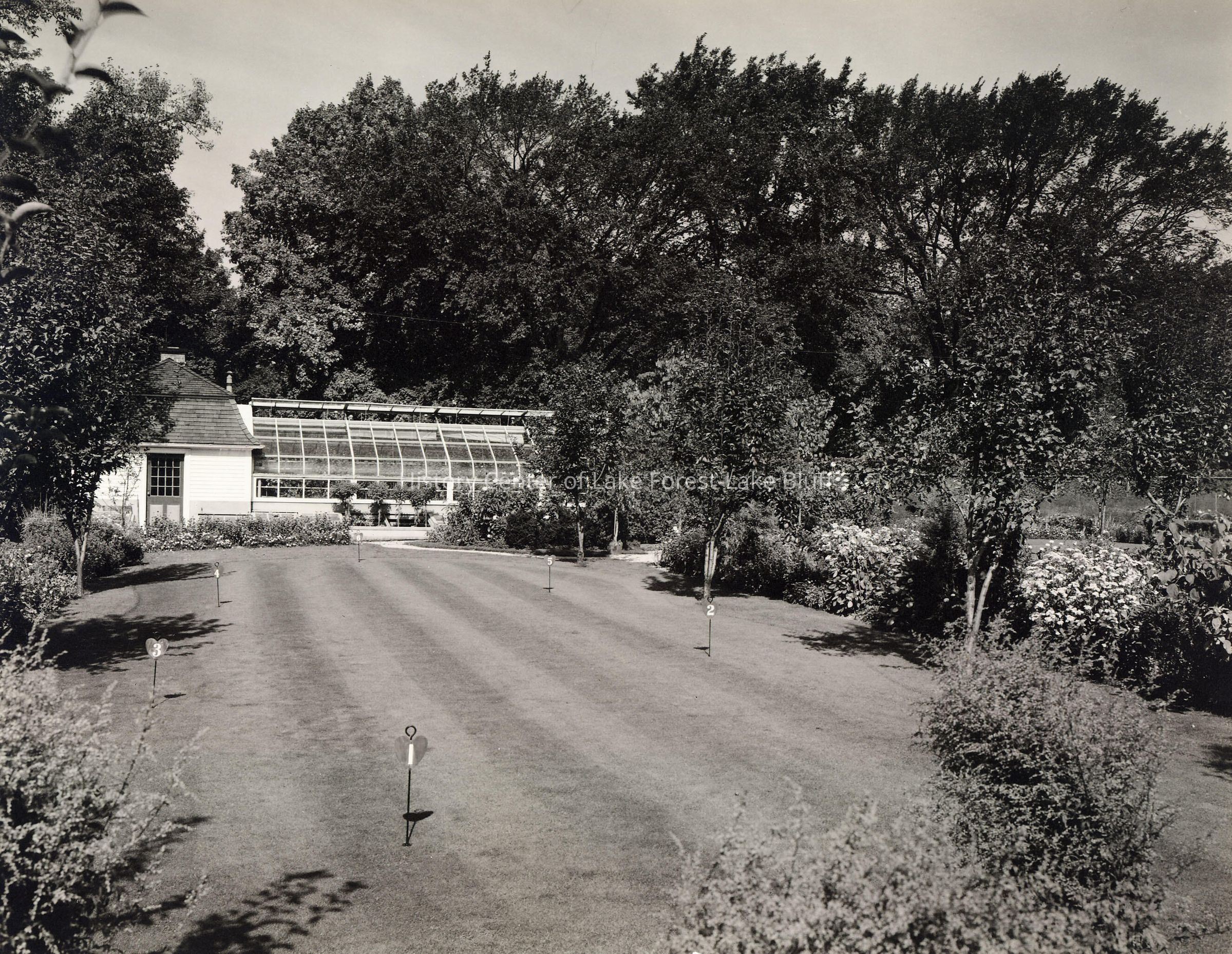 Lawn with croquet markers, surrounded by flowers and shrubs. There is a greenhouse in the background.