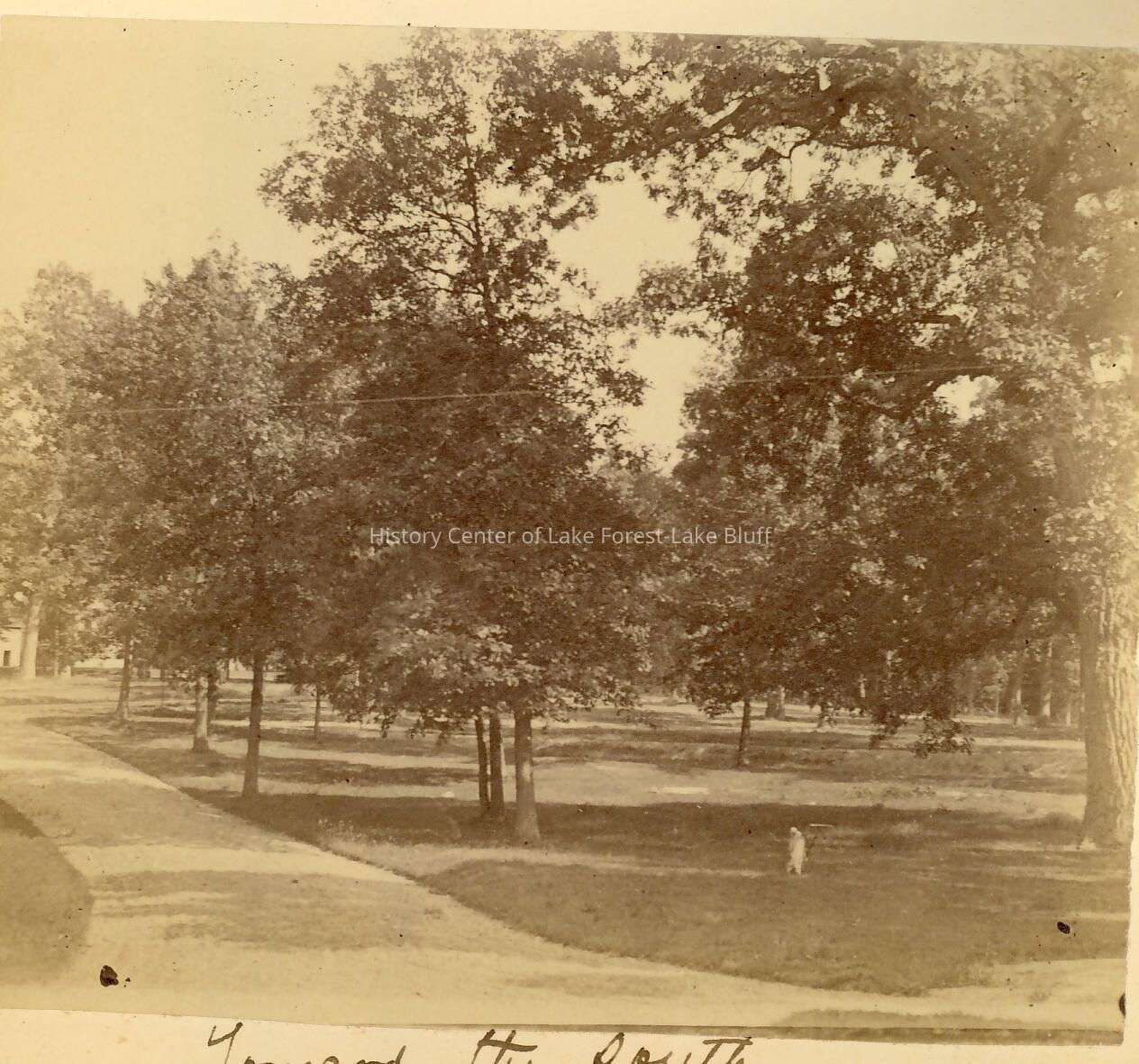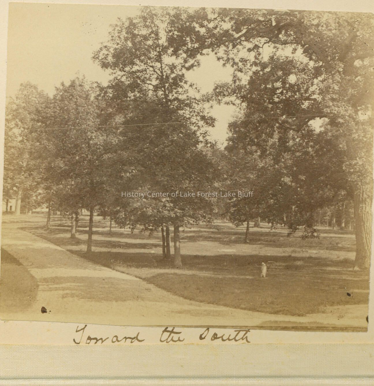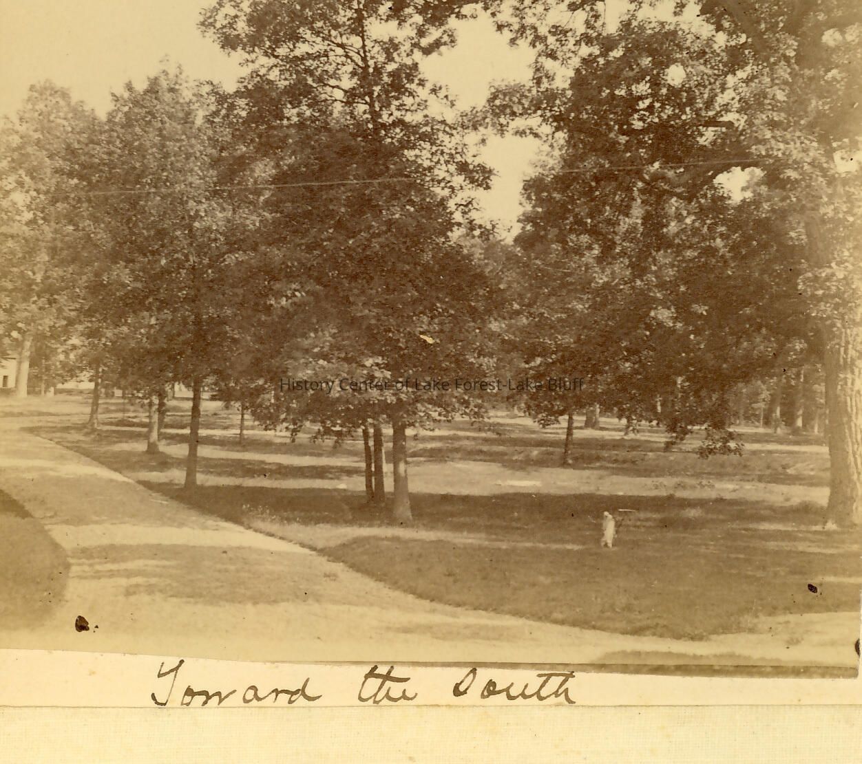 View of lawn and driveway on or near the McClure Manse, toward the south Gienhame (McClure Manse) 487 East Walnut Road, Lake Forest Rev. James G. K. McClure; Cobb & Frost 1885 photo is mounted on an album page
