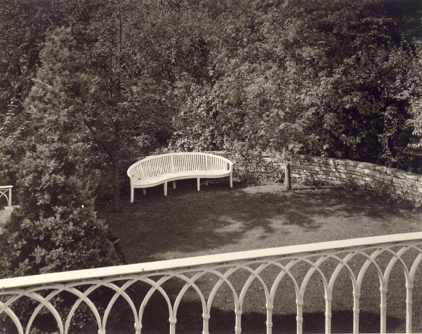 Garden view with white curved bench in front of low stone wall. Lawn is surrounded by trees, with a wrought iron fence in the foreground.
