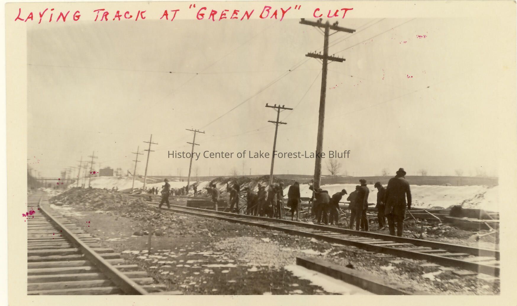 North Shore Line Skokie Valley Route Construction Laying track at "Green Bay" cut. construction west of Lake Bluff 4/21/1926