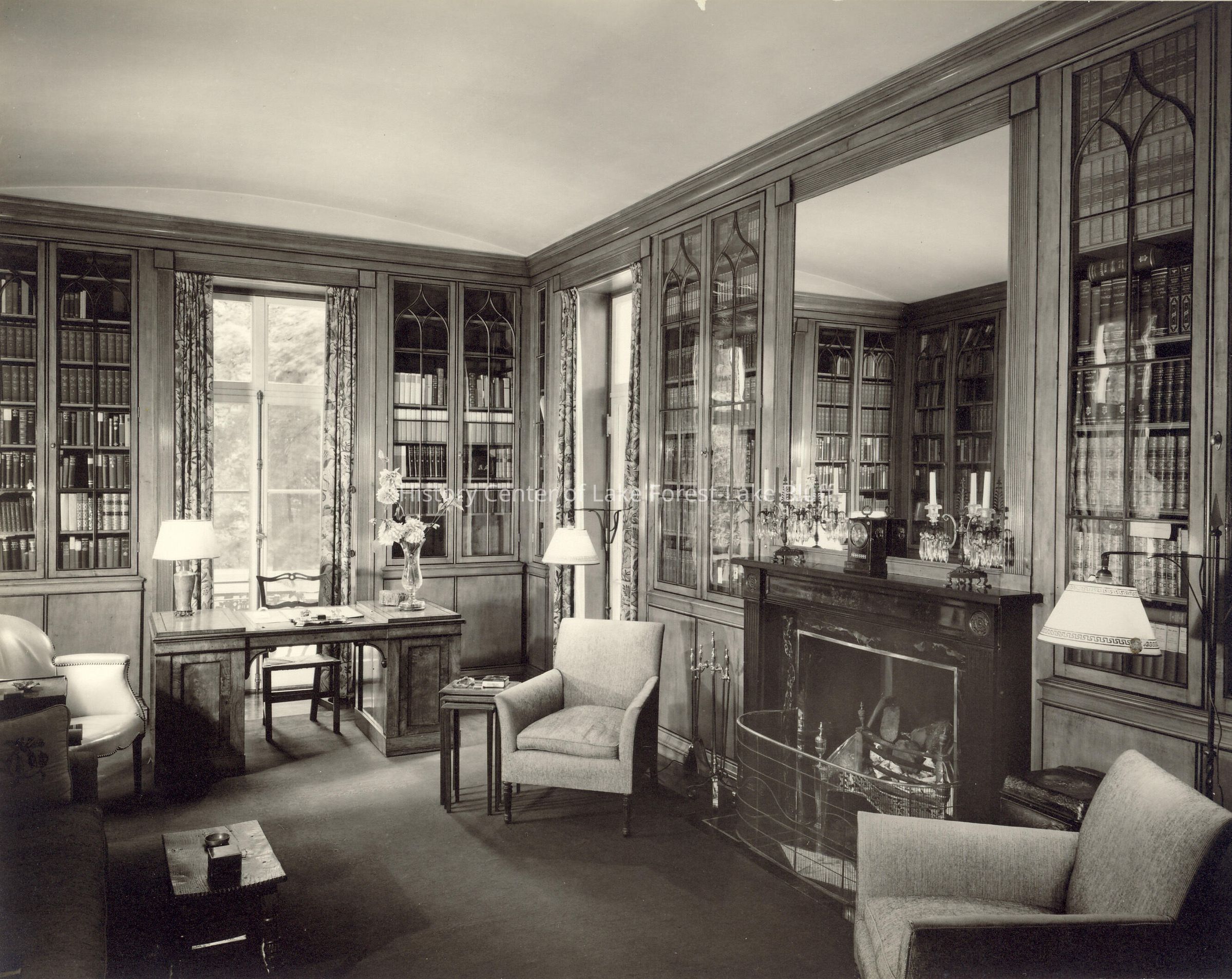 Library floor to ceiling glass-doored bookcases; dark fireplace with mirror above flanked by two chairs; and desk at far end.