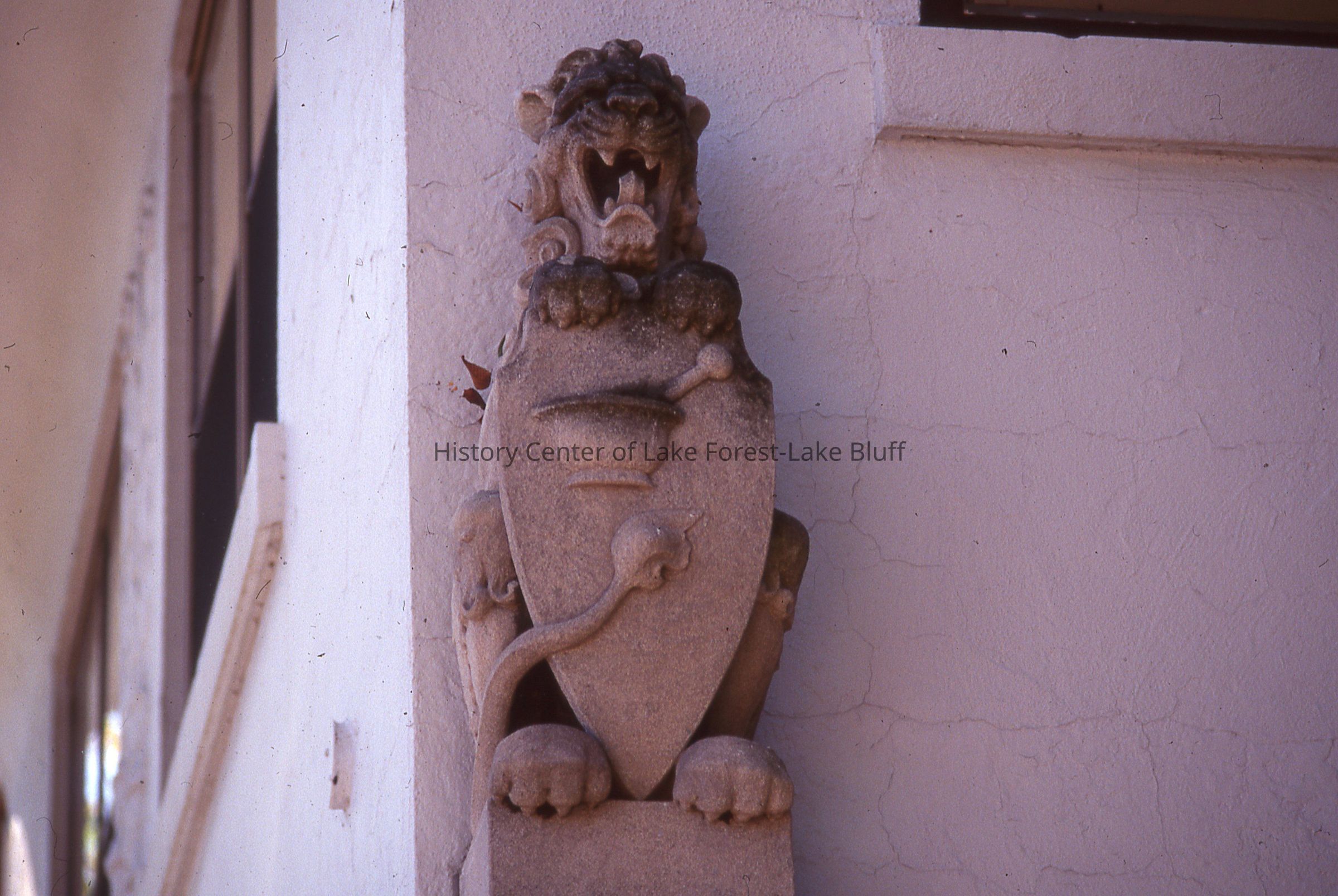 A sculpture of a lion holding shield with a mortal and pestle on it.