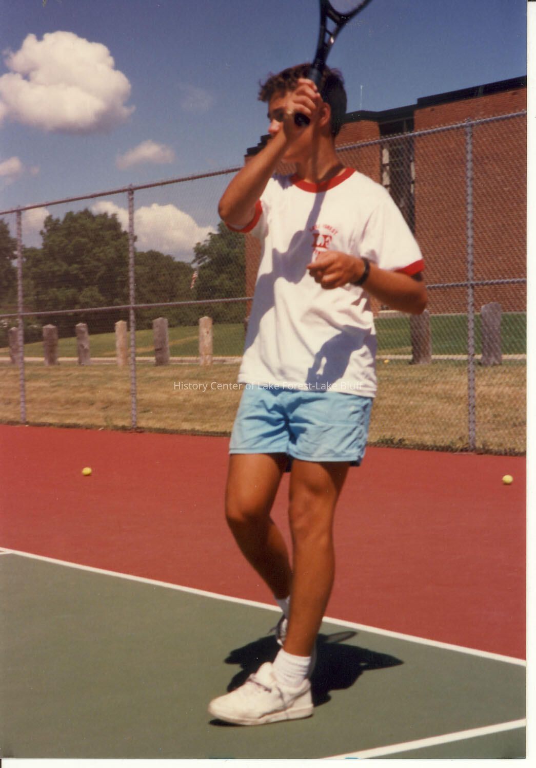 young man playing tennis at Deerpath Park tennis courts, could be an instructor; wearing light blue shorts and white shirt with red trim.