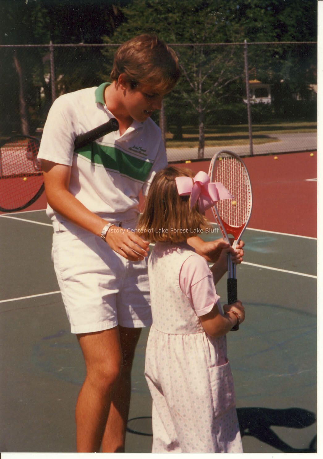 Adult showing a young female how to hold a tennis racquet, probably West Park tennis courts.