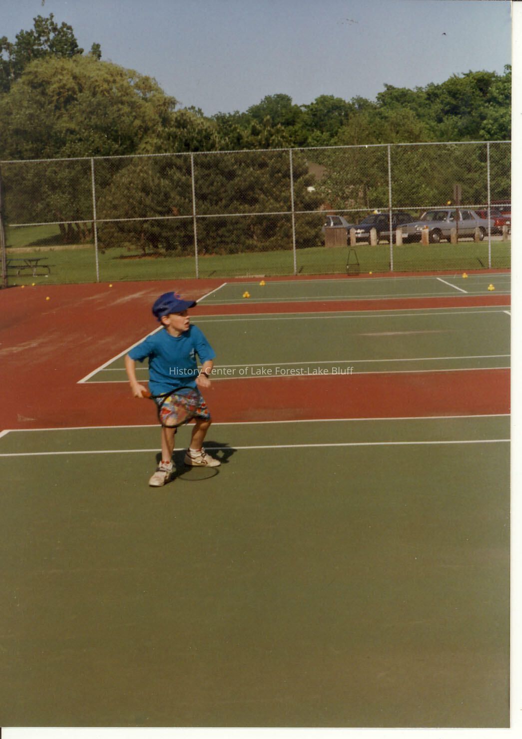 Boy in blue shirt, blue hat and multicolored shorts, ready to swing his racquet on the tennis court