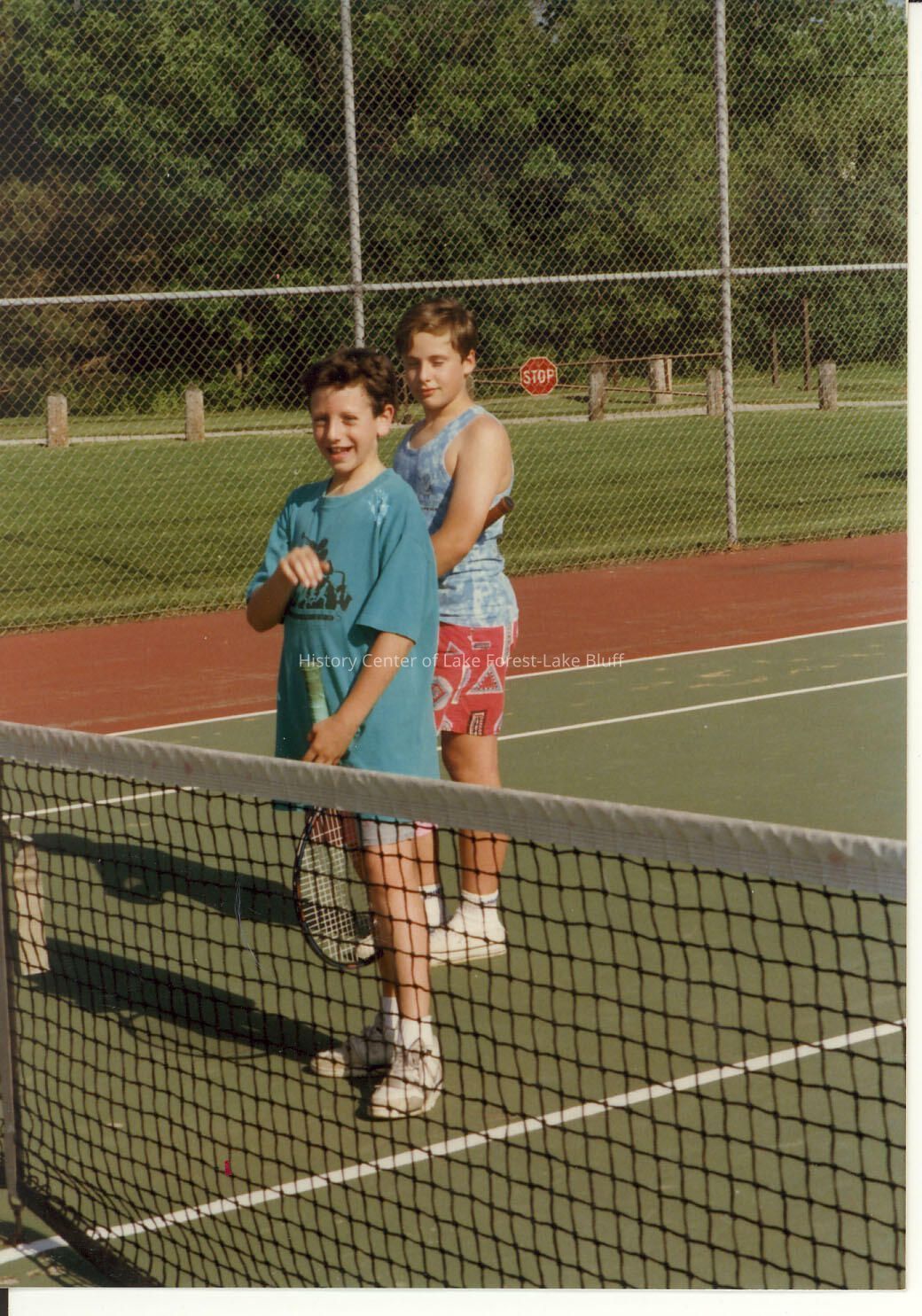 Two boys standing at the net, just hanging out- one is wearing a blue t-shirt and the other is wearing red shorts and a blue sleeveless shirt, probably at Waveland Park.