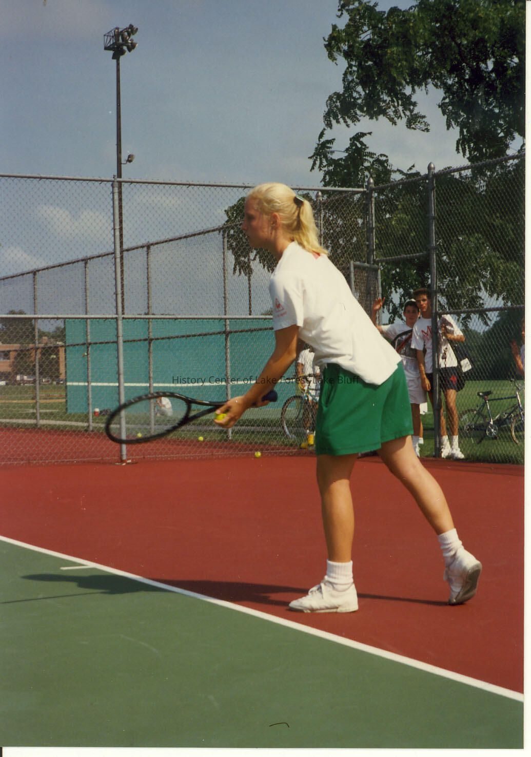 Girl at the foul line at Deerpath Park tennis courts, she's in the middle of serving a ball, she has blonde hair, in a pony tail, she's wearing green shorts and a white t-shirt
