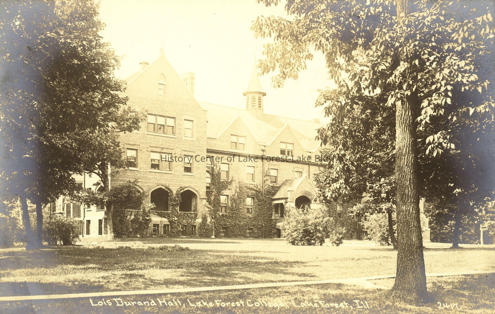 Black and white sepia toned horizontal postcard of Lois Durand Hall, Lake Forest College. Four story masonry structure with center entrance and steeple in center. reverse of postcard is blank, address is indicated as 521 N. Sheridan RoadPhotograph Details