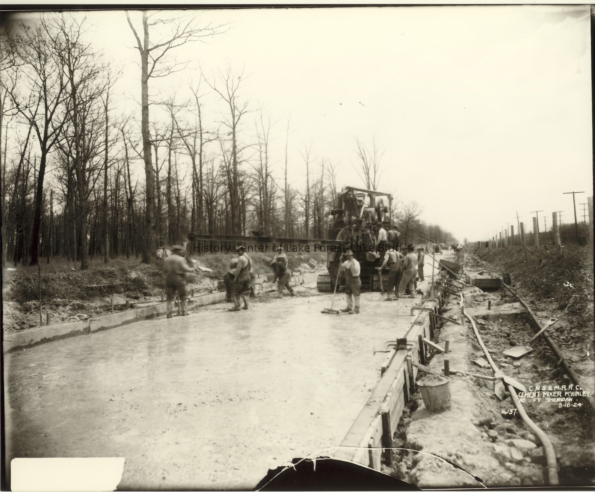 Lake Forest McKinley Road Rebuilding in 1923 re North Shore Line C.N.S. & M.R.R.C. cement mixer and workers looking south toward Fort Sheridan layout and paving of McKinley Road, later known as Sheridan Road May 16, 1924