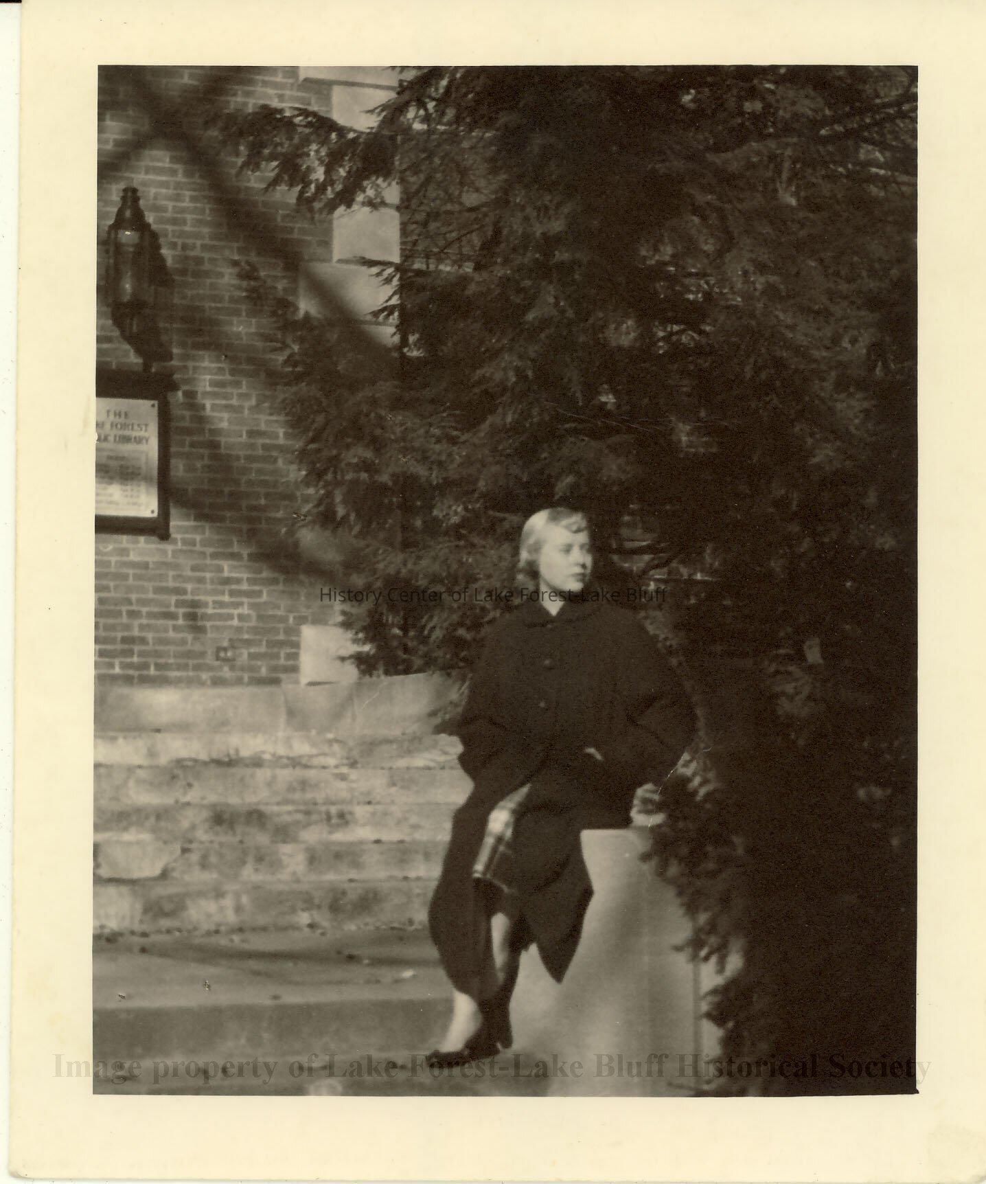 Black and white image of Louise Wells Kasian seated on Lake Forest Library steps. Dated February 9, 1955. Louise served as director of the library 1968-1978.