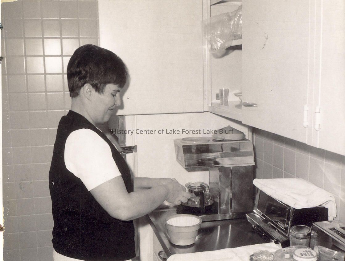 Woman is making coffee in a hospital kitchen. Photographs relating to Lake Forest Hospital collected for the 100th Anniversary of the Hospital by the Development Department.