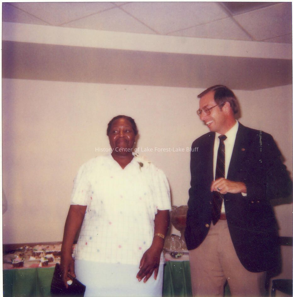 Steve Seiler talking and laughing with a woman. Photographs relating to Lake Forest Hospital collected for the 100th Anniversary of the Hospital by the Development Department.
