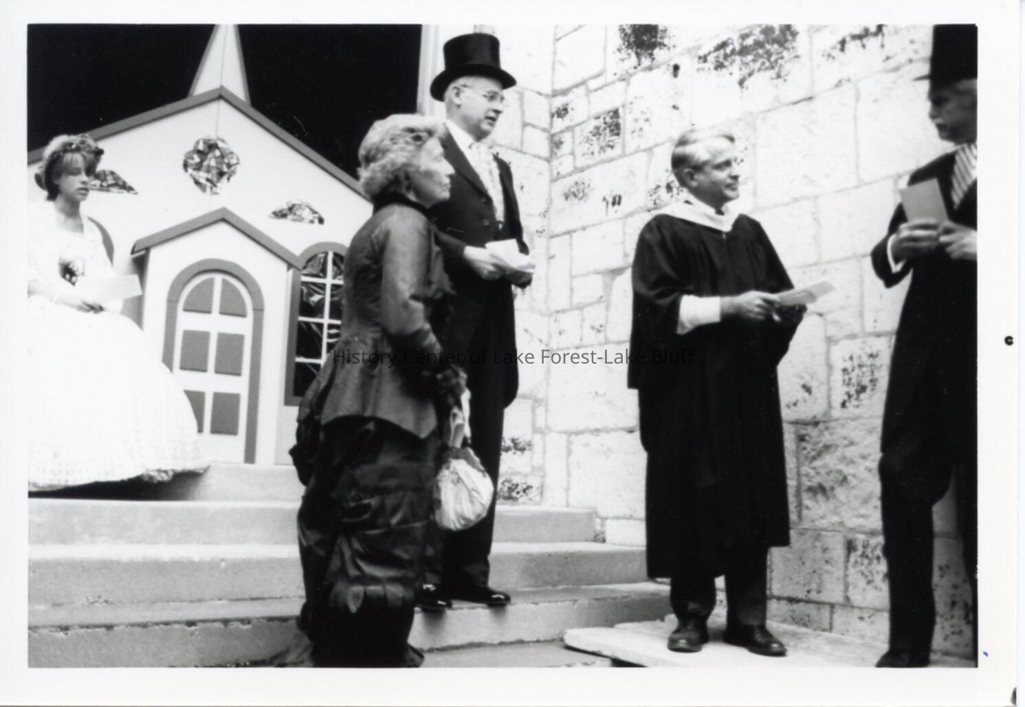 Margot Morrison and replica of the old, wooden Presbyterian Church