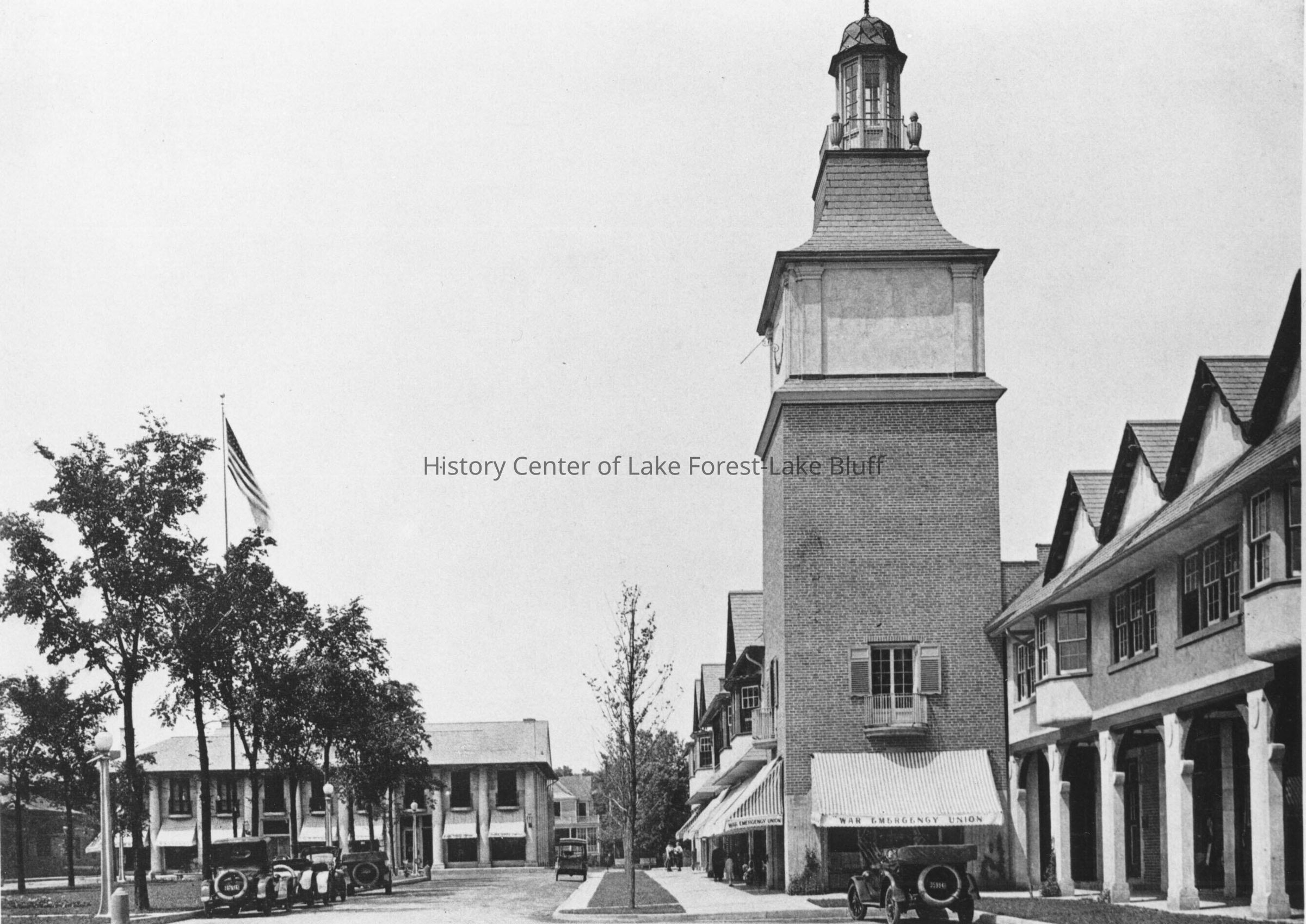 Black and white photograph of Market Square looking west, 700 N. Western Avenue. War Emergency Union, later Garnett's, then Toy Station, then Jolly Good Fellows. From the Western Architect, October 1917.