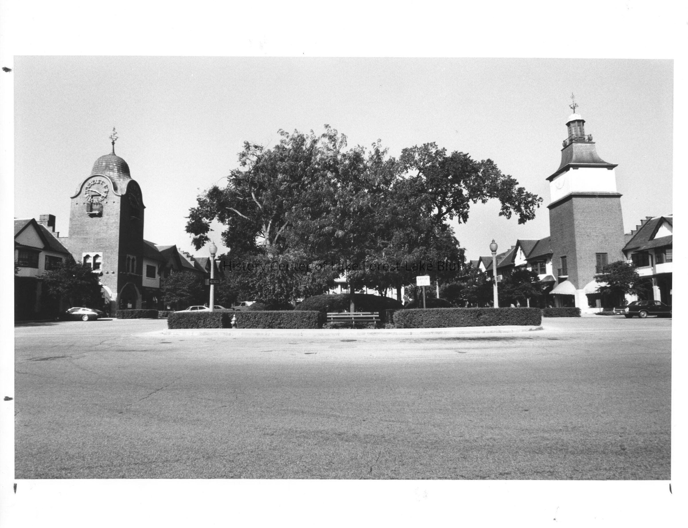 Black and white photograph of Market Square, 700 North Western, 1982. sign for Airport bus, fountain is not visable due to hedge