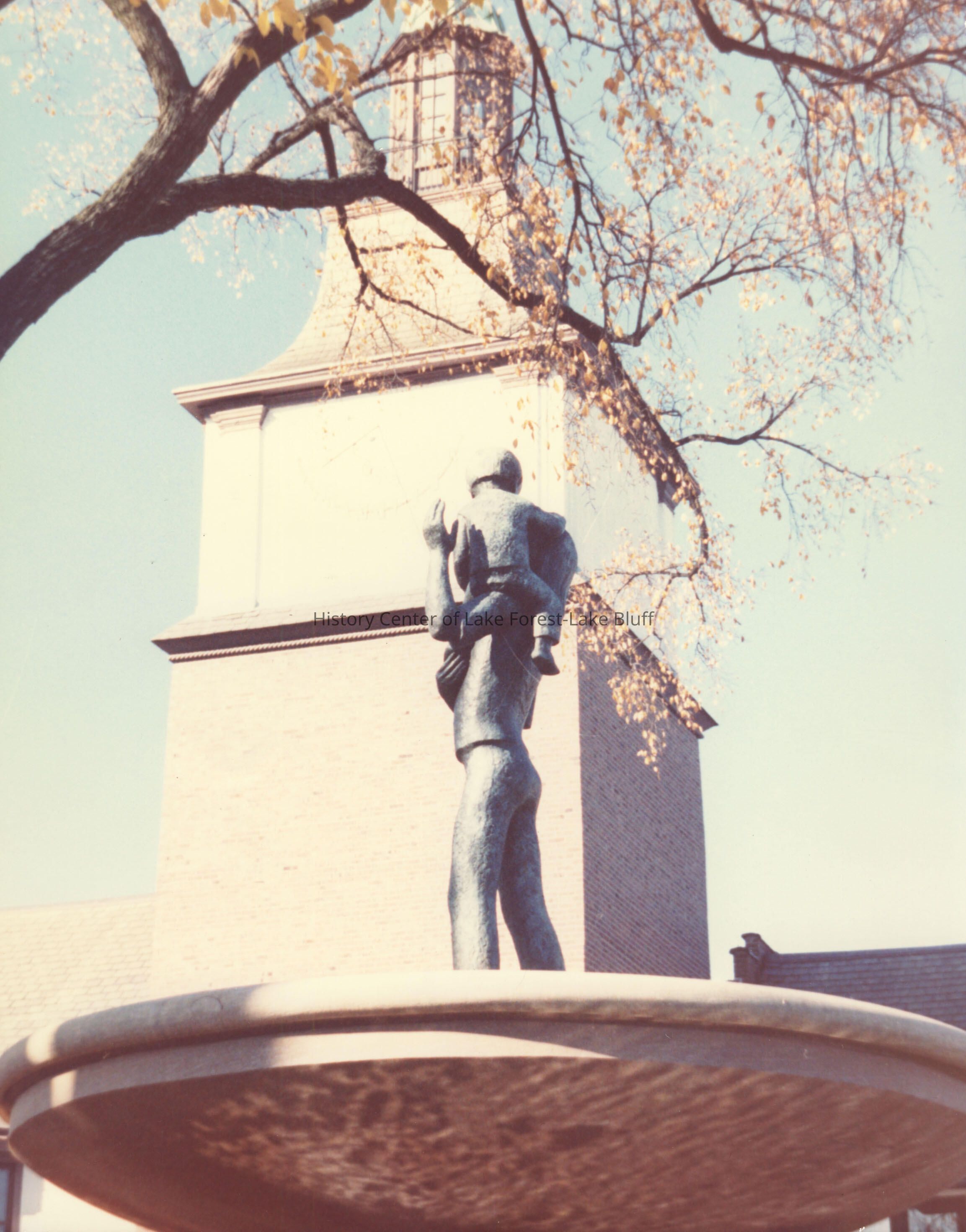 Color photograph of Market Square looking up at the sculpture in the fountain by Sylvia Judson Shaw