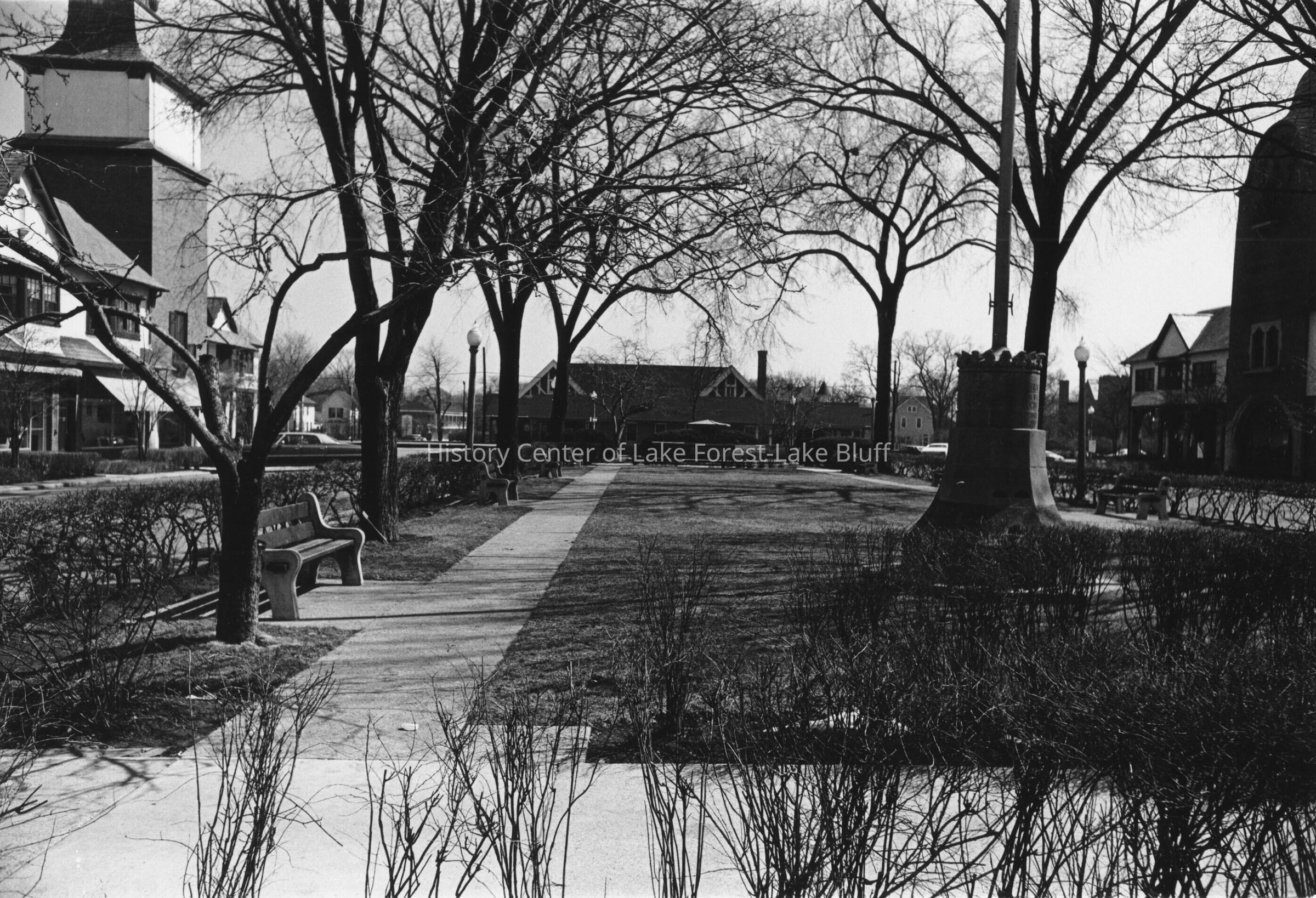 Black and white photograph of Market Square facing east towards the train station, 700 N. Western Avenue.