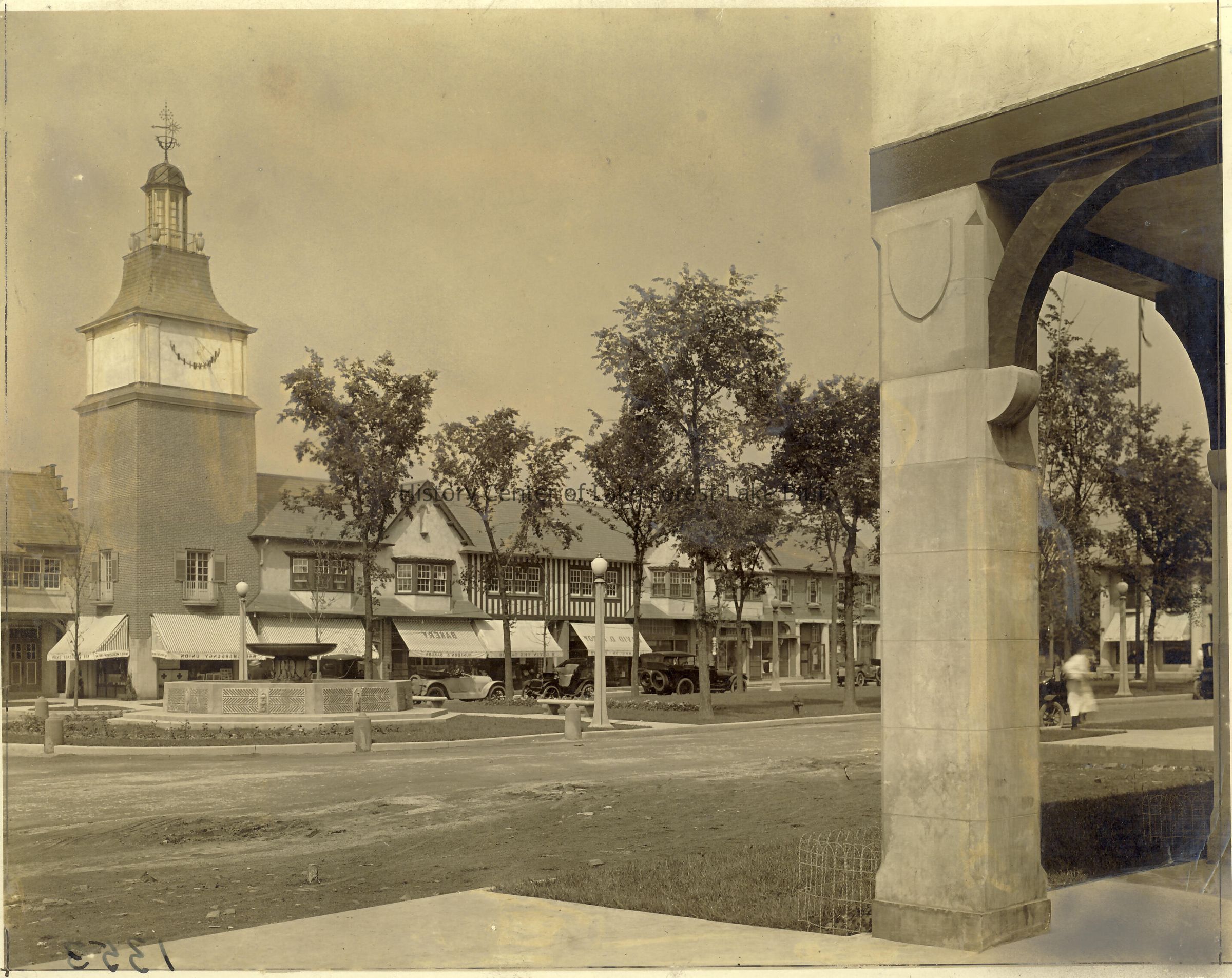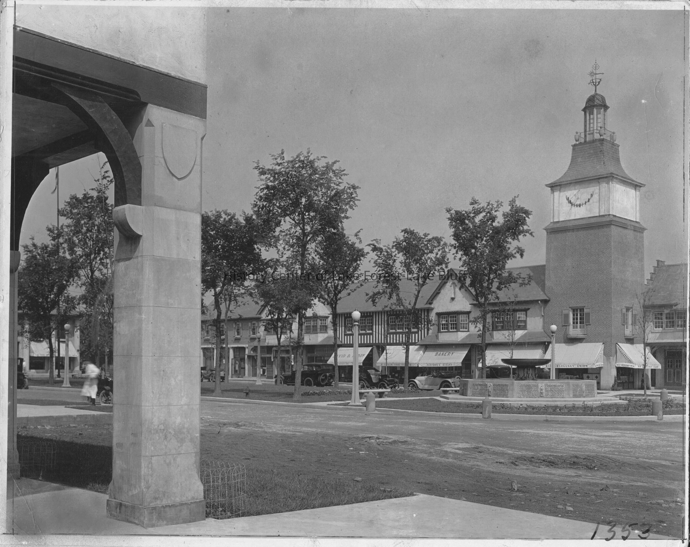 Black and white photograph of Market Square, Lake Forest, Illinois. c. 1917-1918 pictured are War Emergency Union, Huntoon's Bakery (23 Market Square), H. Levin, The Tailor, David D. P. Roy , (Shrubs, Plants)