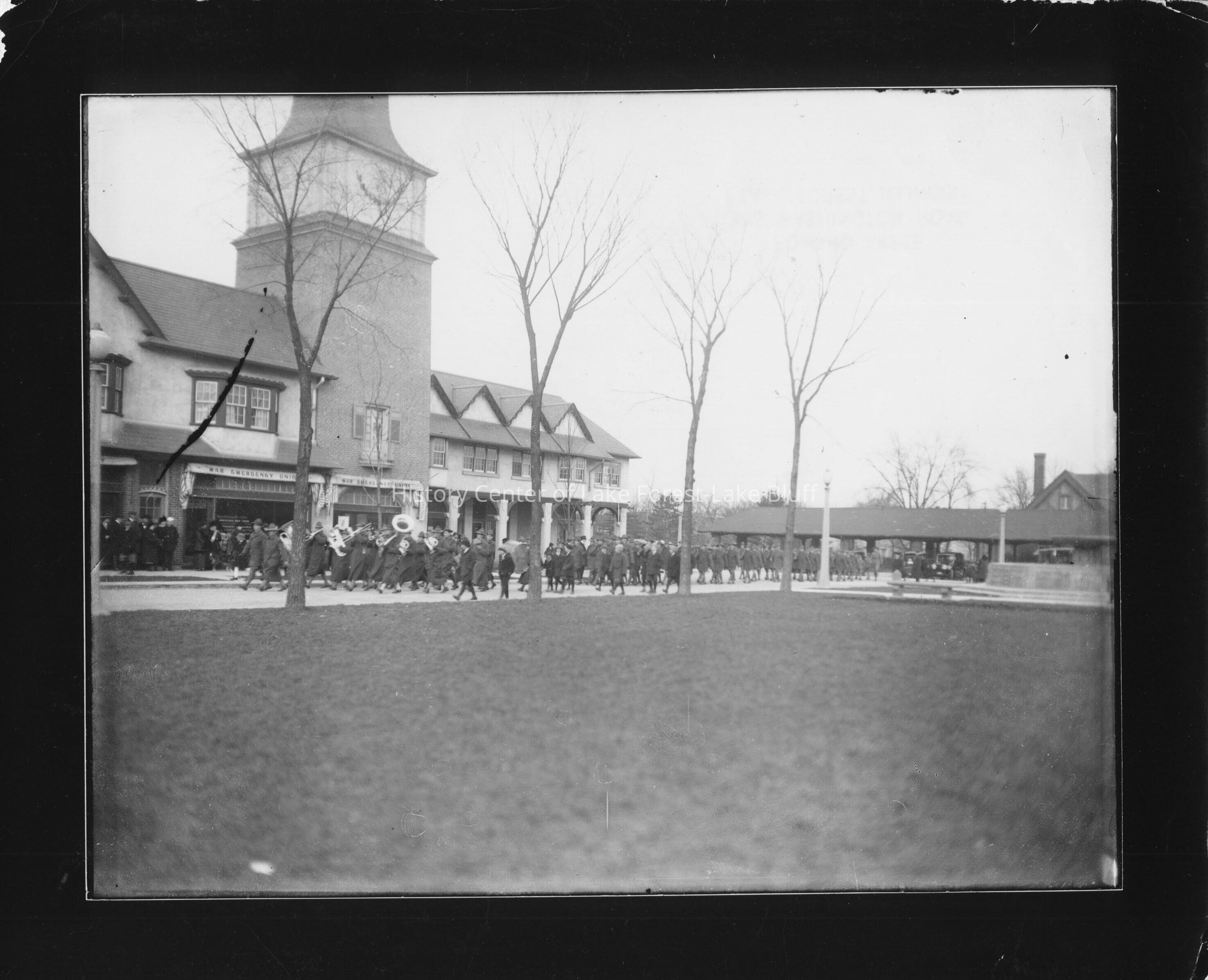 Market Square parade, flagpole dedication, 1917 showing are the north tower, train station and the War Emergency Union store front copy of photo is by Edward Arpee World War I